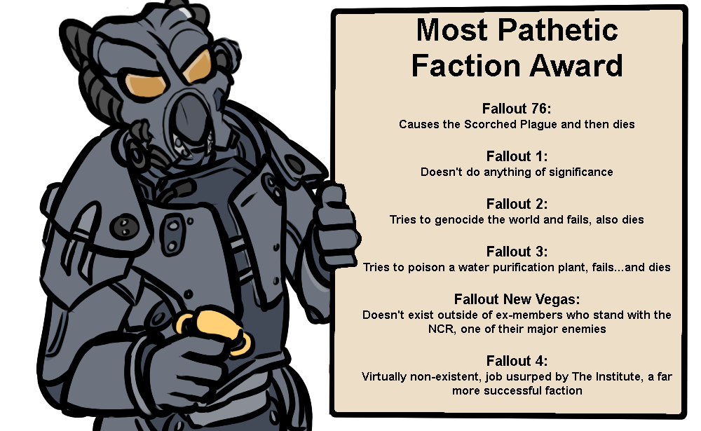 The greatest irony of Fallout:>The Enclave are the bad guys>Yet they made not one, not two, but THREE sets of power armor POST-WAR all the while rapidly expanding on FEV>Their scientists are top notch, just one of them being able to solve stealth boy induced schizophrenia in nightkin >Schematics left from their base in Adams Air Force base would've created the Prydwen>The Enclave would've won had it not been for player plot armor, Curling 13 was game over for the wasteland and an FEV poisoned Capital would be free real estateALL of this in 200 years, and pathetic wastelanders are still living in scrap huts. Recent Fallouts have just better made the case that the Enclave were right all along, characters in 3/4/76 are so fucking retarded they should've been gassed.