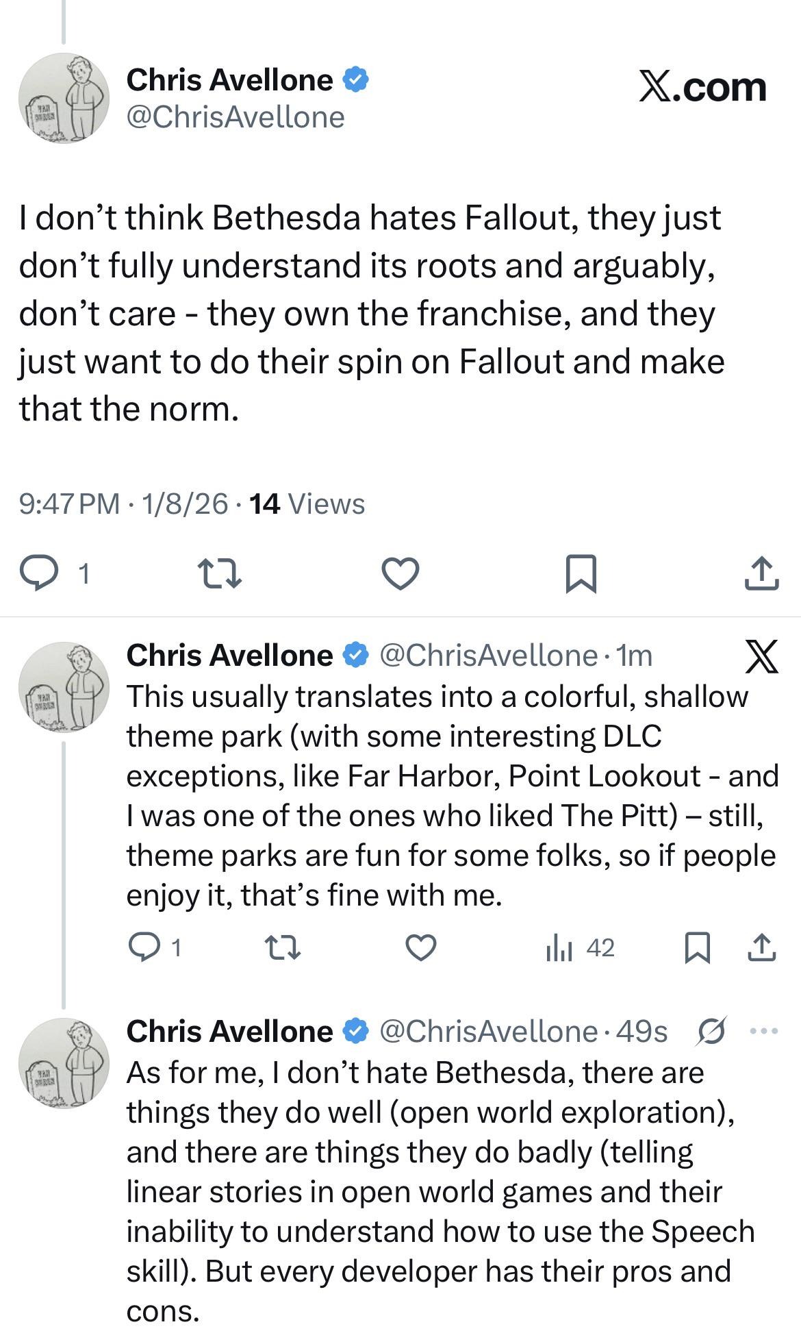 >>557489531>>557489087Most Fallout settings have an existential threat to the civilian population (in 3, it's actually the Enclave more than slavers/raiders but whatever) which the Enclave would have to deal with first and leverage as PR to get the average unmutated wastelander on their side. Autumn had the right idea, but the writers of 3 were mostly focused on bringing the lore to a 3D worldspace instead of following up on the themes from the first games.In 2, they kind of had the last hurrah of their fully isolationist streak, leading to their destruction. The story in 3 is basically a repeat of that, so the only place to go from here would be an Autumnist-inspired Enclave that's looking to secure the wasteland against anarchists and mutants instead of wholesale genociding everything in sight.