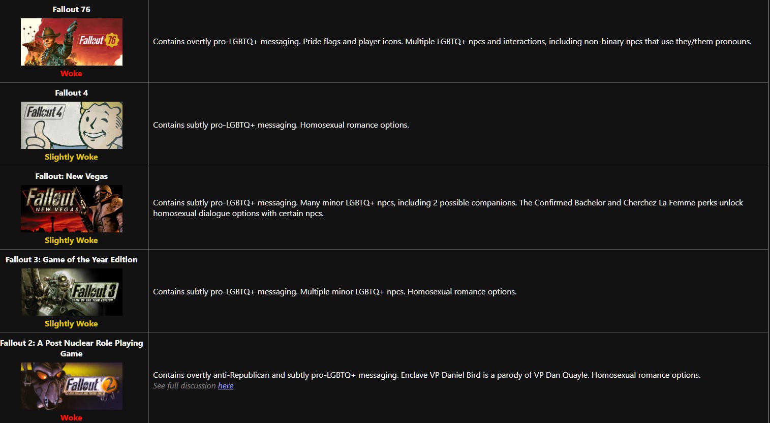 >>557691036The only "woke" fallout is 76.>WHAT? I CAN OPTIONALLY CHOOSE TO BE GAY IN THIS ROLEPLAYING GAME??!!