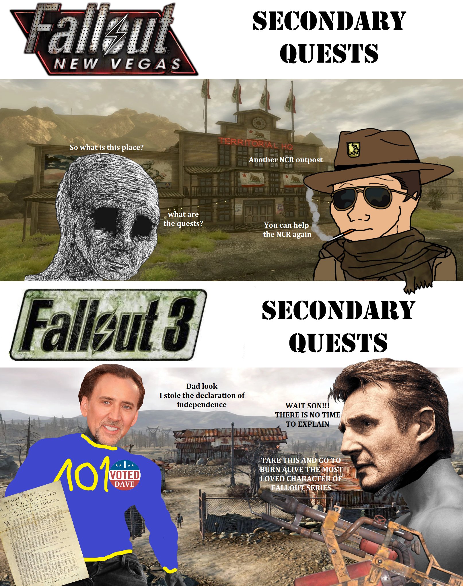 i hate lonesome road. literally just a linear shooter where you stop/accelerate nukes from falling only for them to be completely redundant.>nuke NCR>nobody knows or cares>nuke legion>nobody knows or caresthere's no impact, all it does is give you some decent locations to go to with a shit ton of loot. if fnv was kenshi, NCR/Legion would at least be starving.