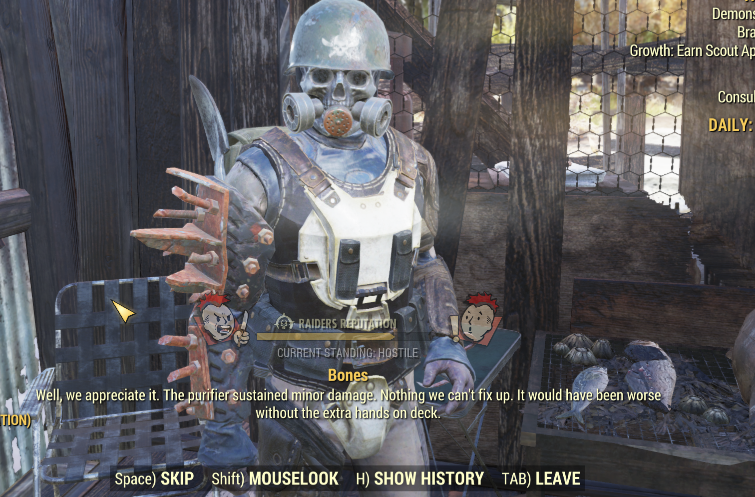 Fun fact; In 76 if you are still hostile with raiders you can start doing their dailies (at least on the ohio adventures) by just beating everyone to bloody pulp few times until they yell "enough enough" or something similar and then they turn neutral and you can talk and do their guests.