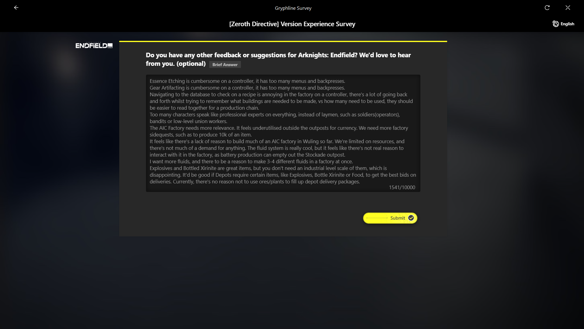 >Rate the FeedbackI feel like I've got a good idea with the depot deliveries. For the Wuling Depot, you have to make bottled Xirinite or sugar water for the full price. Just selling originium ore, or plants lowers the price bid to 40% of it's value.I think that's a good idea, for making the factory more important, because currently, I feel like it's a bit irrelevent.Sidequests to make 50k of x item would also be good, it gives a reason to make a fuckton of an item, then tear it out for another production line.The current meme of filling all the fluid pools with Mountain Dew is the kind of content that should become canonised as side quests.