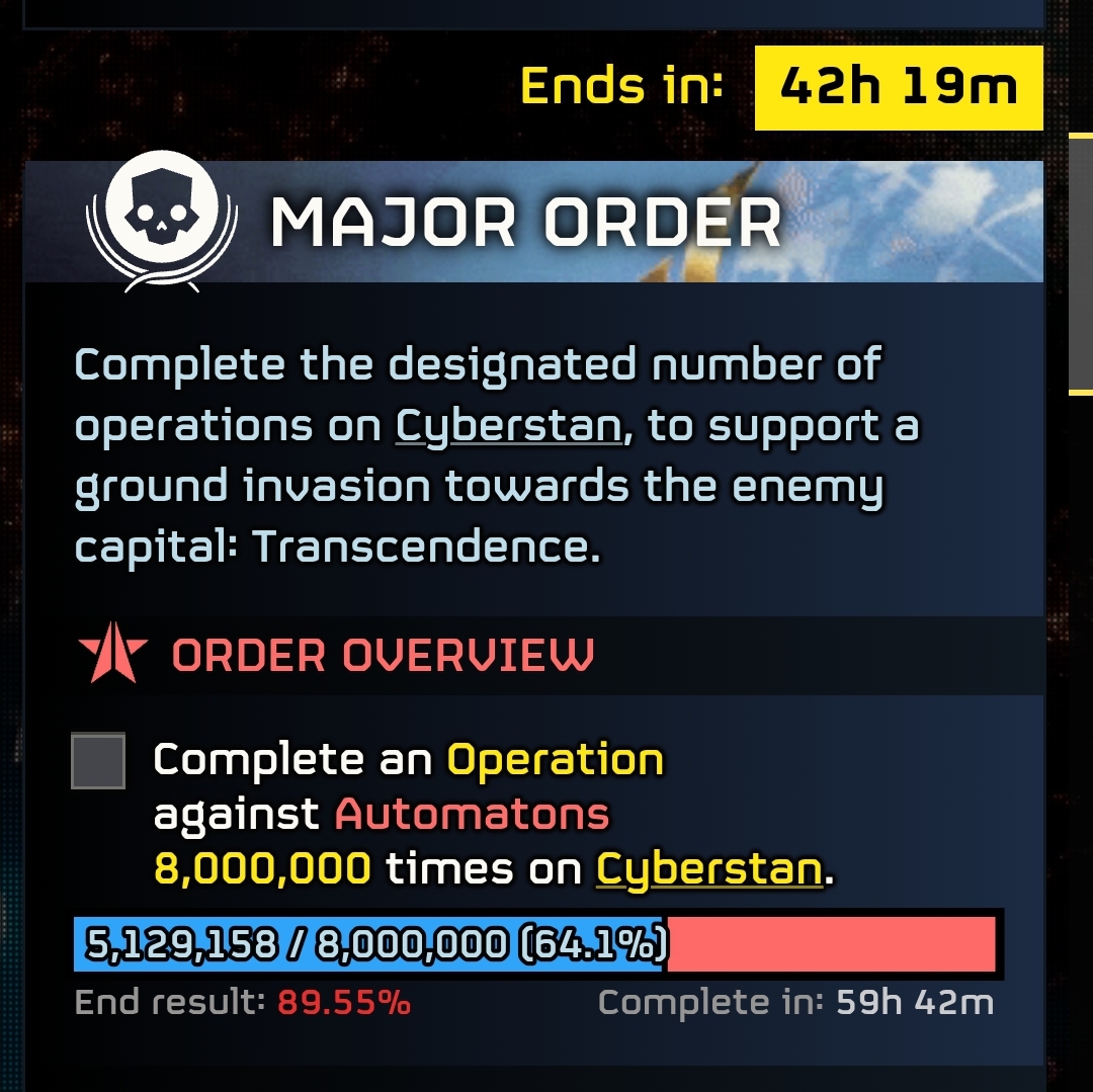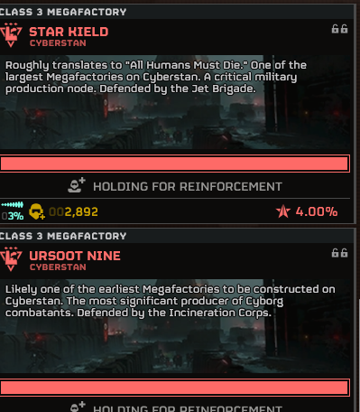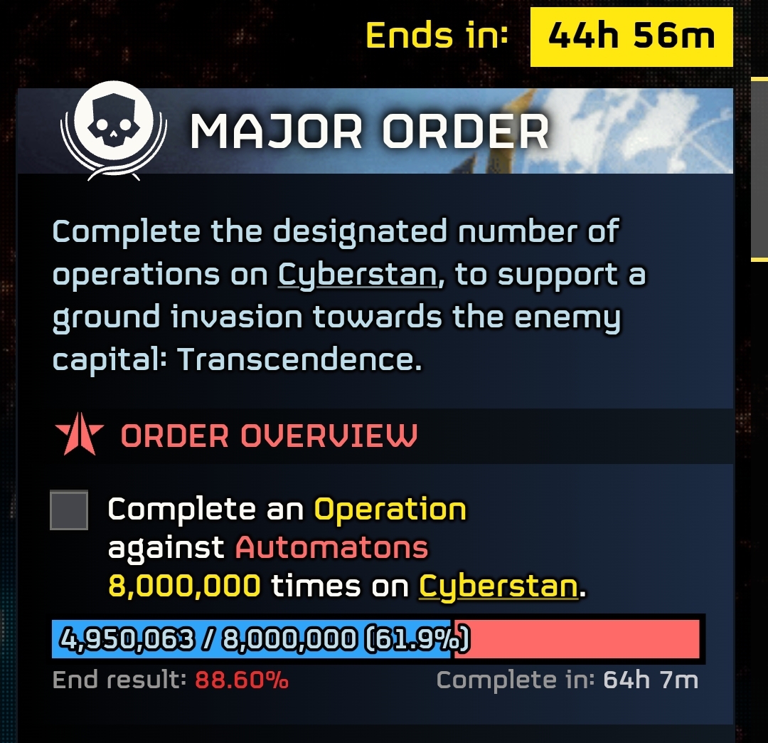 >35 million reinforcements will be brought by the DSS in ~1.5 hours, also bringing back its liberation bonus and allowing us to start boosting it again>the squid MO will be complete in ~6.5 hours, further increasing reinforcements by an indeterminate amount>Omniparitus is slated to fall in ~6 hours, less once the DSS comes back on station and increases liberation rates>the way to Ursoot Nine and Star Kield will open, paving the way to TranscendanceWe may not win this MO, but ultimately all that matters is capturing the Megafactories.