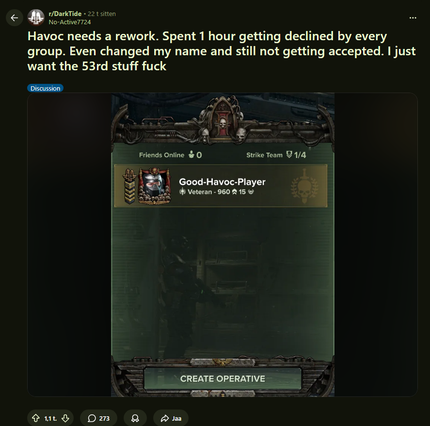 >did Havoc solo when it came out >miserable time bunch of faggots who will a) never fucking invite me to a mission and b) suck dick themselves so even if I did get invited or host it was torture>hit H40 after a couple days anyway>stop playing it because it's so horrid >now>friends buy darktide >actually playing havoc with 3 friends who have like 100 hours each>they're better than randoms despite not giving a fuck about minmaxxing>hit H40 again basically effortlessly, just give them pointers on positioning cause I know the maps wellinsane. This game is a co-op game after all
