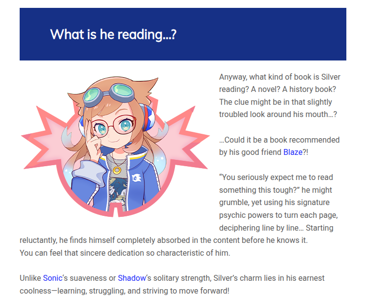 >>557591658Young Child who steps up from Tails in the movies.Last Hope of a doomed future from Silver in Forces.Person who keeps going when all else is lost from Shadow in Generations (Shadow literally just stands on the sidelines clapping for him)Best friend to the Chao from Cream in Chao Talesin Frontiers they make Ancient parallels to Tails, Amy and Knuckles and each take turns telling SONIC that he is smarter, heartier and stronger than them after SONIC soloes them and the shitty friends are forced to just fetch him his emeralds.He has no soul, he just steals from everyone else like the shitty leech for self-inserters that he is.