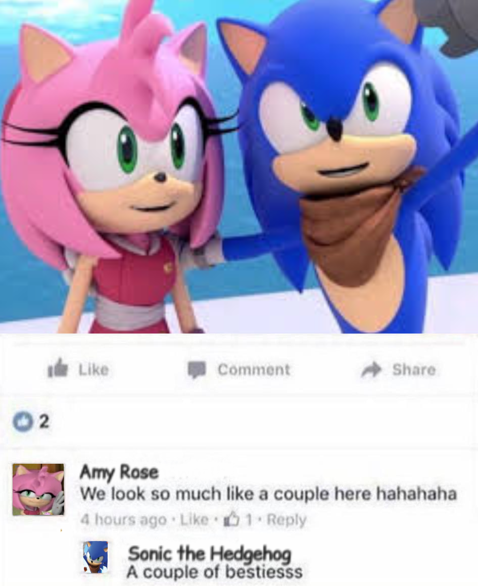 >>557593430>shipping wars when amy and Sally were super close friends just behind bunnie.because the only Amy that acts like that is preboot Amy. IDW game boom and X Amy all hate other girls being romantic with Sonic except in 06 for some reason.