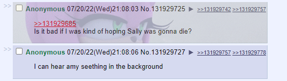 >>557594048You're talking to the wrong anon man, I'm just the guy posting the page.Truth to be told i don't care at all about shipping much less amy and and sally crazy fans.
