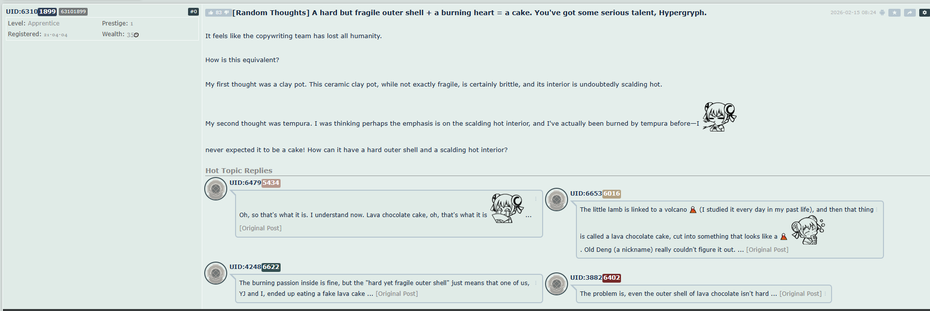>>557560443I just assumed it was a very bad translation but 'molten lava' cakes are a thing in NA at least so it fit the theme
