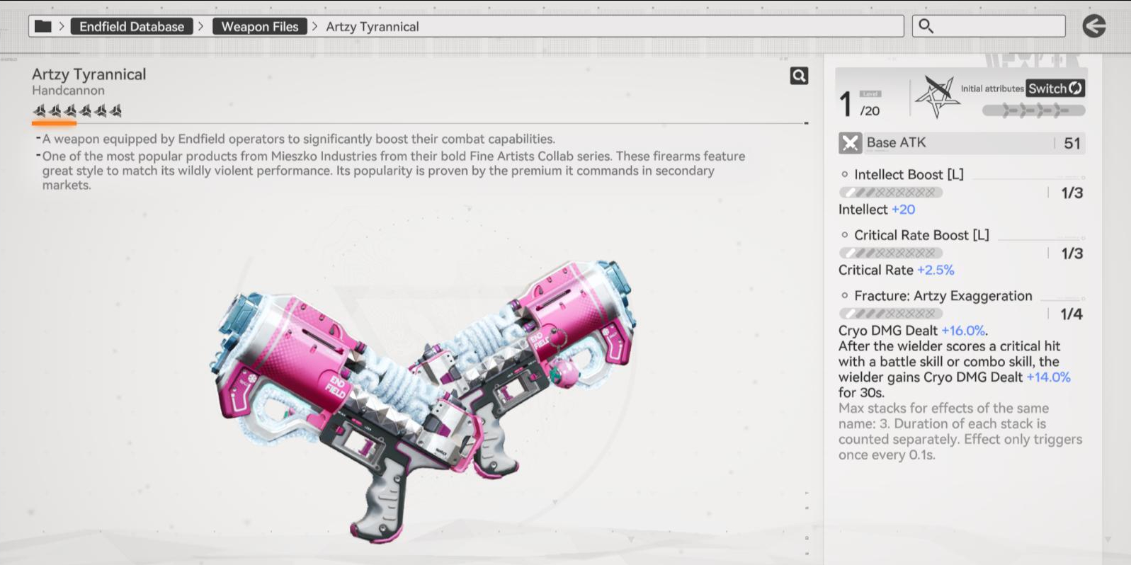 Previous thread: >>557541860>Official Websitehttps://endfield.gryphline.com/en-us>Official EN X (News)https://x.com/AKEndfield>DEV Comm (Developer Updates)https://endfield.gryphline.com/en-us/news/3846>Gilberta PV'shttps://www.youtube.com/watch?v=8hZVxeiSmQ4 [Embed] - EP [Snap Shot]https://www.youtube.com/watch?v=BQom1V9TdbM [Embed] - Operator Storyhttps://www.youtube.com/watch?v=h70w5ZmXLkE [Embed] - Combat Demo>Chartered Headhunting ScheduleFebruary 7th to February 24th --- "The Floaty Messenger", (Gilberta)February 24th to March 13th --- "Hues of Passion", (Yvonne)TBA>Reward CodesENDFIELDGIFTENDFIELD4PC>Twitch Dropshttps://endfield.gryphline.com/special/third-party-binding?channel=twitch>Voyage to the Stars (Ongoing until March 4th)https://endfield.gryphline.com/activity/voyage-to-the-stars/en-us/>Wikishttps://wiki.skport.com/endfield (Official)https://perlica.moehttps://warfarin.wiki/enhttps://endfield.wiki.gg/>Blueprint Guideshttps://talospioneers.com/en>Stickershttps://drive.google.com/drive/folders/13KH3L6QPIKkVH7pBddv4uxwmwJsnOtklhttps://drive.google.com/drive/folders/1OuVtjv1k-9c3M6n7d4PX3CGG5bkwH04ahttps://drive.google.com/drive/folders/1AStB8bzFk3lSwMwczWPkFYCBrZe0vHOghttps://drive.google.com/drive/folders/1yS0lqUhxf8tBRtpDFfCU1y16IS2sSeF7>Fr/end/sSubmit your info, /end/min:https://forms.gle/Fo7BhZMKaKqiWyL19View other /end/mins:https://docs.google.com/spreadsheets/d/1YtxiDss0hgEQhLlZgpfzyGrJrzUcqDzOS9T6IH-BiVc/edit?usp=sharing