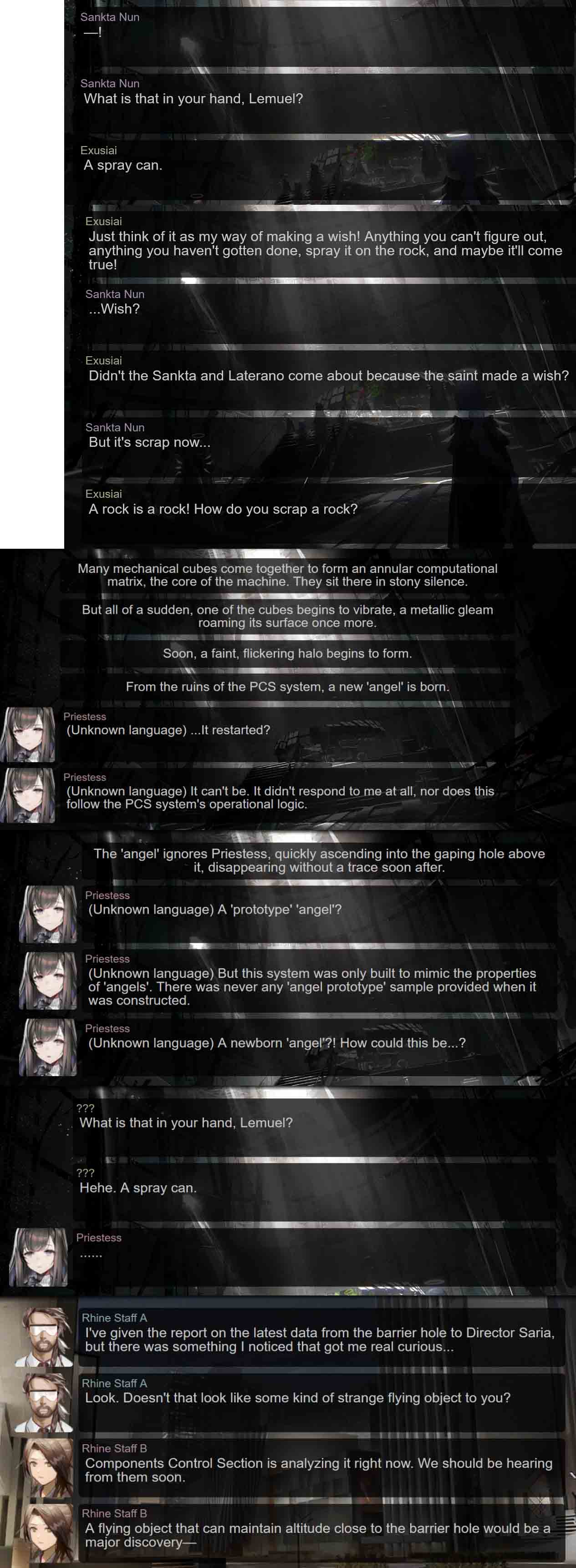 >>557617469Since you are clearly a moron, let me set up a time line for you.>Three months after the disaster, as stated by Executor, Executor and the Pope talk about how the Law is still in effect after they destroyed it. The Pope says he believes the Law has left them a blank slate/new start. And also says he's opening up the place where the cubes are at to the public.>Then there's Priestess check out the cubes, they start moving and vibrating, before the glowing angel pops out. So clearly none of the sankta were there yet considering they'd fucking mention if their god is still alive and operating.>Then Exu comes in (and mentiones it's been 3 months) and graffitis it, causing Priestess to leave