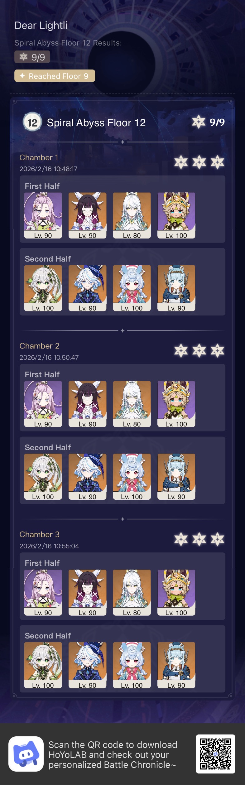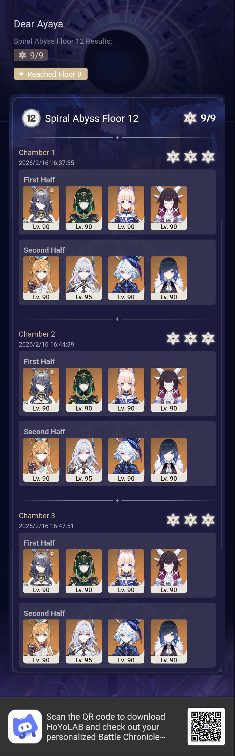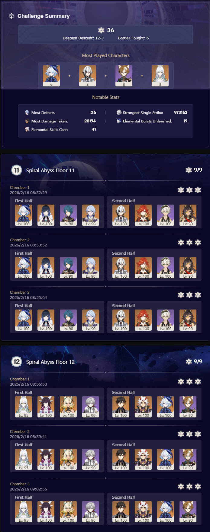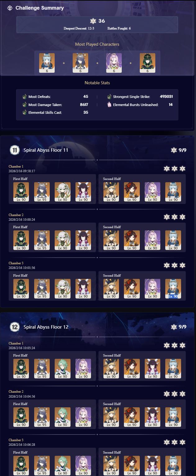>Too shy to post or just wanted to make sure I get your clear?>Can't solve captcha to post?Send them to me privately here:https://form.jotform.com/253493679126468---------*PREVIOUS ABYSS*Luna IV 2026-01-16 Spiral Abyss StatisticsSample size: 204 (4/gig/, 8/gig/ and /gigvmg/, /v/)Finalized: 2026-02-16Character Usage (List view):https://files.catbox.moe/aubu8l.pngOther Statistics:https://files.catbox.moe/xbj5pb.png---------Congratulations to these anons for being:"4/gig/'s Top 10 SOVLFVL clears of Spiral Abyss 2026-01-16 Luna IV"#1. Clear #188 - >554531354 - 951 points#2. Clear #171 - >554256648 - 941 points#3. Clear #170 - >554256603 - 939 points#4. Clear #191 - >554552960 - 925 points#5. Clear #31 - >554034203 - 917 points#6. Clear #58 - >554049071 - 916 points#7. Clear #80 - >554067965 - 914 points#8. Clear #195 - >554612625 - 909 points#9. Clear #38 - >554038504 - 908 points#10. Clear #118 - >554095160 - 902 pointsLeaderboard: https://files.catbox.moe/ipp3vh.png---------How is the ranking tabulated?Every submissions get 1000 points as default grade,then the grade will be reduced based on voting data of this poll(Vote if you haven't/ Change your vote:https://strawpoll.com/B2ZB9wmqAgJ)Submissions with similar grade will then be ranked by the order of submission time(earlier submission gets higher rank)---------I'll be collecting Abyss clears now. (also SO clears if you want to share)Feel free to post your clear when you're done.