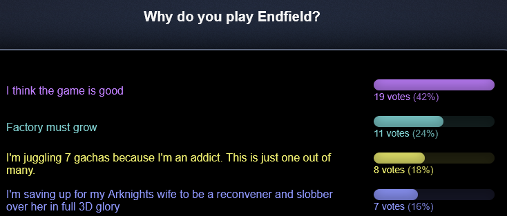 Previous thread: >>557611792>Official Websitehttps://endfield.gryphline.com/en-us>Official EN X (News)https://x.com/AKEndfield>DEV Comm (Developer Updates)https://endfield.gryphline.com/en-us/news/3846>Gilberta PV'shttps://www.youtube.com/watch?v=8hZVxeiSmQ4 - EP [Snap Shot]https://www.youtube.com/watch?v=BQom1V9TdbM - Operator Storyhttps://www.youtube.com/watch?v=h70w5ZmXLkE - Combat Demo>Chartered Headhunting ScheduleFebruary 7th to February 24th --- "The Floaty Messenger", (Gilberta)February 24th to March 13th --- "Hues of Passion", (Yvonne)TBA>Reward CodesENDFIELDGIFTENDFIELD4PC>Twitch Dropshttps://endfield.gryphline.com/special/third-party-binding?channel=twitch>Voyage to the Stars (Ongoing until March 4th)https://endfield.gryphline.com/activity/voyage-to-the-stars/en-us/>Wikishttps://wiki.skport.com/endfield (Official)https://perlica.moehttps://warfarin.wiki/enhttps://endfield.wiki.gg/>Blueprint Guideshttps://talospioneers.com/en>Stickershttps://drive.google.com/drive/folders/13KH3L6QPIKkVH7pBddv4uxwmwJsnOtklhttps://drive.google.com/drive/folders/1OuVtjv1k-9c3M6n7d4PX3CGG5bkwH04ahttps://drive.google.com/drive/folders/1AStB8bzFk3lSwMwczWPkFYCBrZe0vHOghttps://drive.google.com/drive/folders/1yS0lqUhxf8tBRtpDFfCU1y16IS2sSeF7>Fr/end/sSubmit your info, /end/min:https://forms.gle/Fo7BhZMKaKqiWyL19View other /end/mins:https://docs.google.com/spreadsheets/d/1YtxiDss0hgEQhLlZgpfzyGrJrzUcqDzOS9T6IH-BiVc/edit?usp=sharing