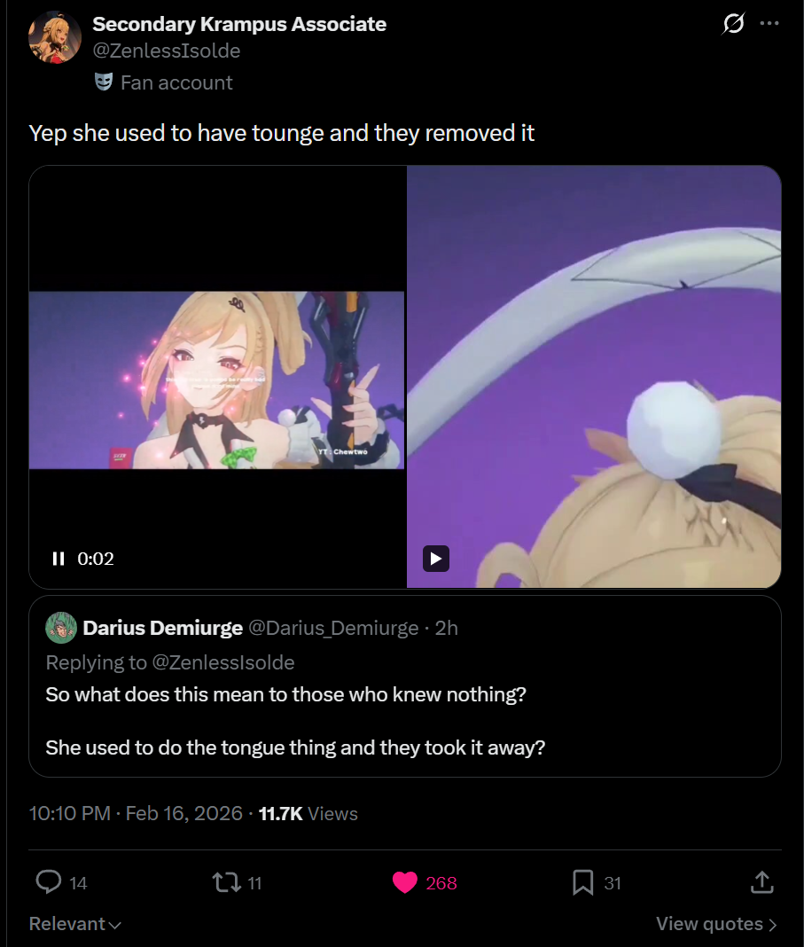Previous: >>557608181>NewsAgent Record | Cissiahttps://www.hoyolab.com/article/43750810Agent Record | Nangong Yuhttps://www.hoyolab.com/article/43737155Version 2.6 "Encore for an Old Dream" Special Programhttps://youtu.be/oTRy9pZ4TYE>Newest Trailer/Teaser/Character demohttps://youtu.be/0DmndMnuh5E (EN)https://youtu.be/TJXSiIESLyc (JP)https://youtu.be/06G8YgOrXTw (EN)https://youtu.be/FJ0HD6RC6PY (JP)>Upcoming Events for 2.6https://zenless.hoyoverse.com/en-us/news/162561A Harmony of Delusions 02/05 - 03/23Angel's Invitation 02/05 - 04/15Delusion Special 02/05 - 03/23Potential Hypothesis: Frosted Feathers 02/05 - 03/23Livestream for Fluttering Wings 02/05 - 03/23Gilded Surprise, Wonderful Boo-ns 02/14 - 02/25Stacking Fortune 02/16 - 02/24Advanced Bounty: Area Patrol 02/25 - 03/02Gravitational Storytime 03/04 - 03/23"En-Nah" Cheersquad Gift 03/04 - 03/23Snap! Hollow Real Showdown 03/09 - 03/23High Score Card Collector 03/16 - 03/23>Redeemable codes (claimable in-game or online)https://zenless.hoyoverse.com/redemptionZENLESSGIFTZZZ25MINAZHAOISFREEShunguangWinterGiftZZZ20265OZ2HDP95IZZZANGELSZZZ26DELUSIONAODDEBUTZZZAOD0206ZZZCREATOR26ZZZCUTENESS>Resources and useful linkshttps://rentry.org/zzzlinkshttps://rentry.org/ZZZ-Friendshttps://rentry.org/ZZZ-Guilds>/zzz/ OP pastebin (use this if making new thread):https://pastebin.com/PzbMf13P