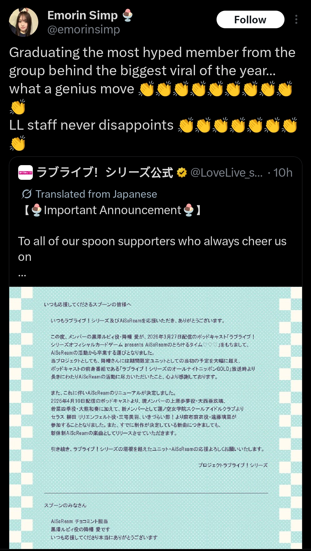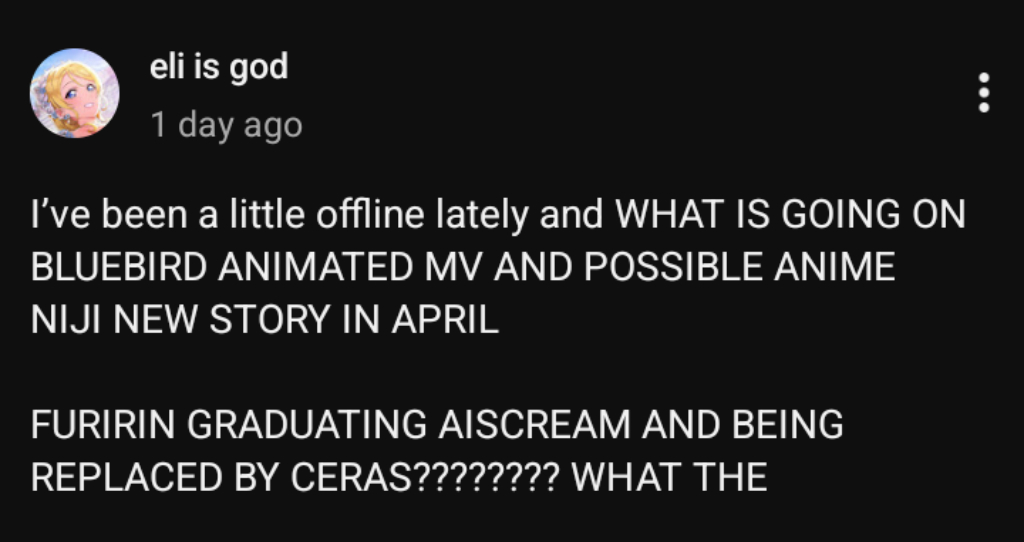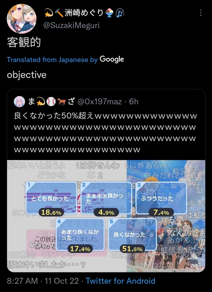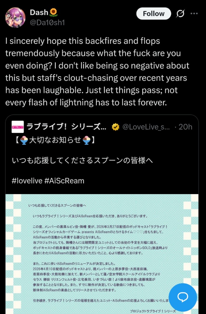 Wonder what the cope will be when a Liella movie releases and does better than any of the Niji movies.