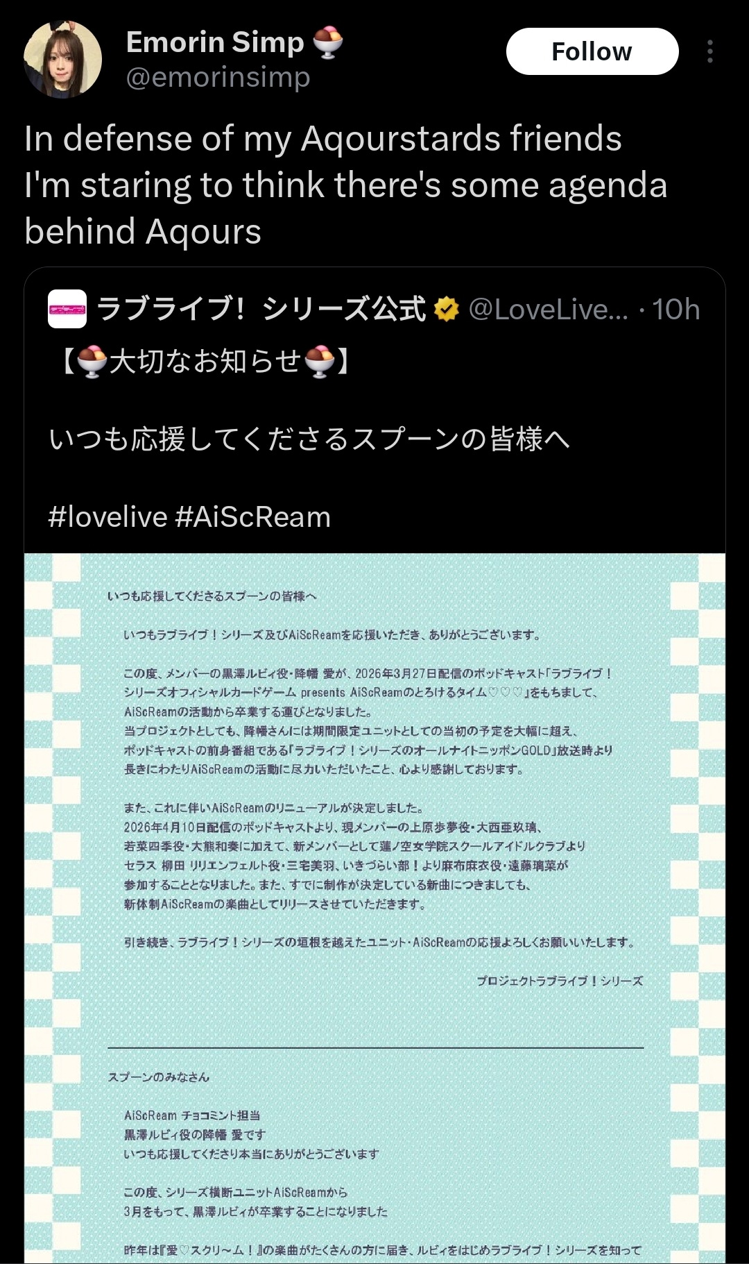 >>557812785>look at profile >chika fuckerits almost like… aqours fans are the ones consistently wishing death on the franchise…