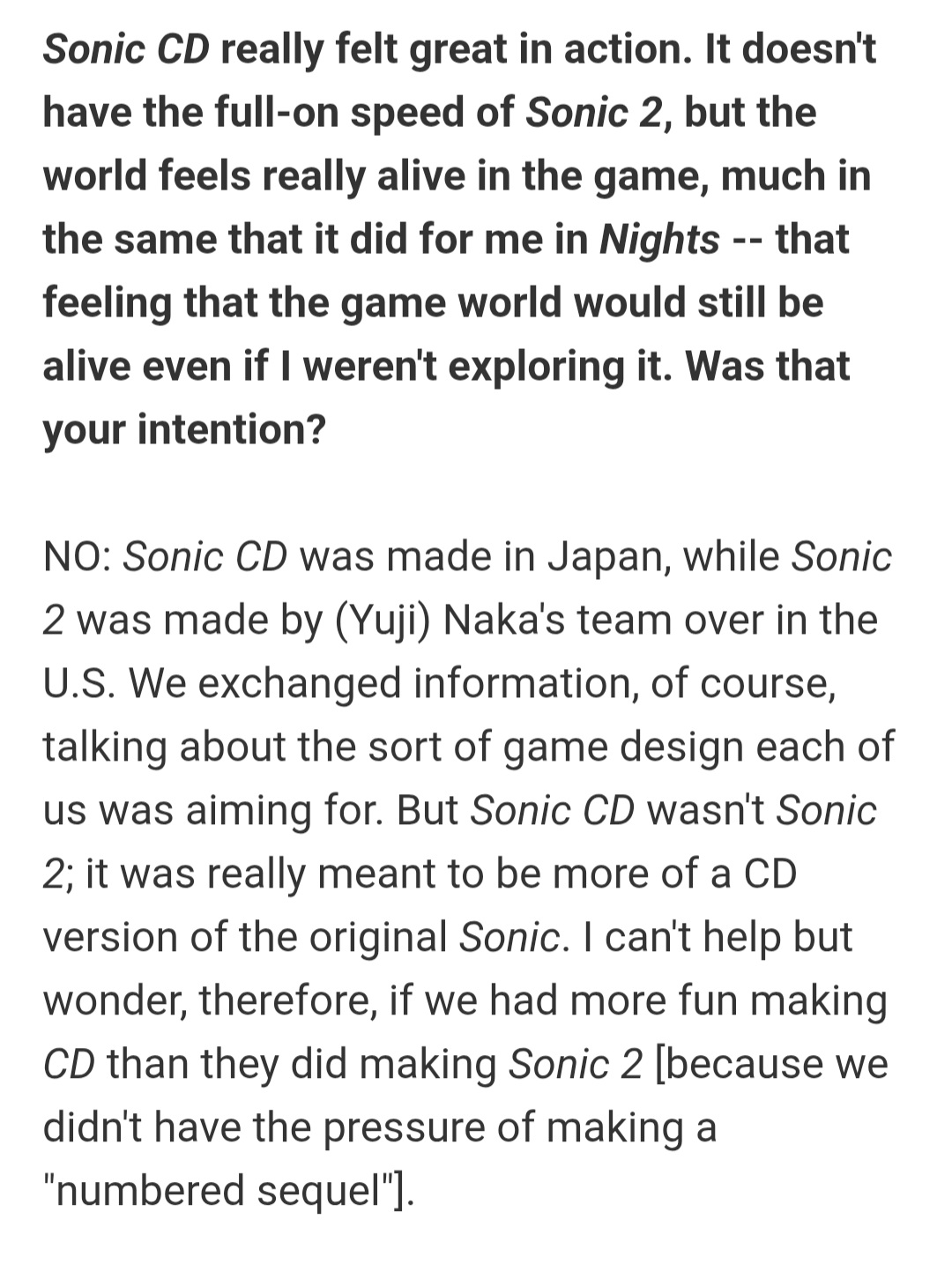 it's designed like a classic game, it has the aesthetics of a classic game, and it doesn't have the stench of nu-sonic team