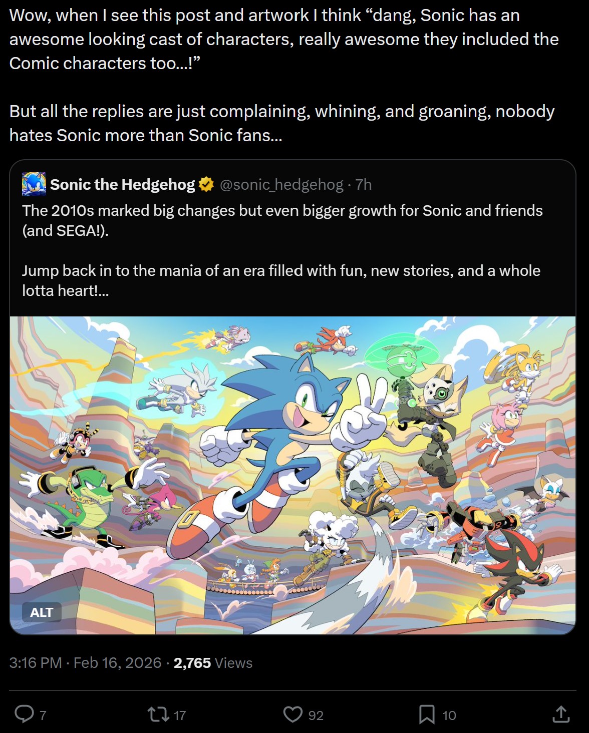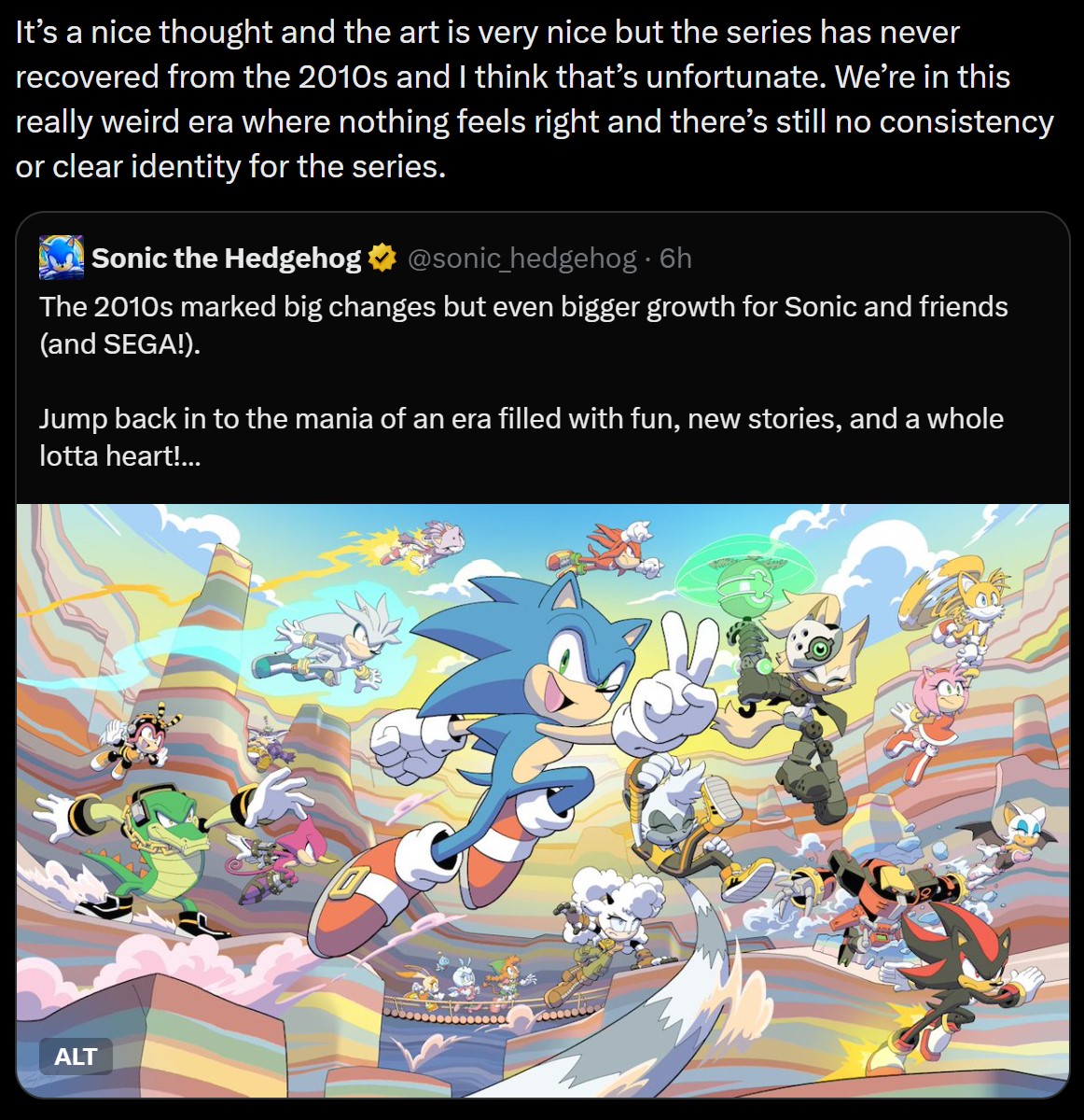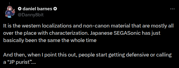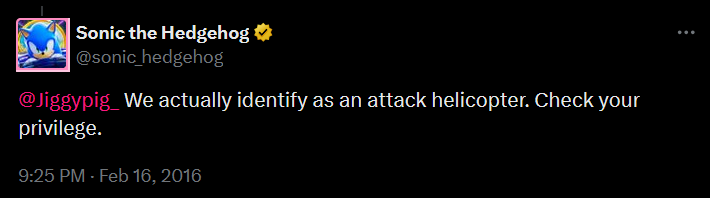 There is growing pushback against Sonic lefty Twitter though. Just give it more time to grow and it will have an effect eventually