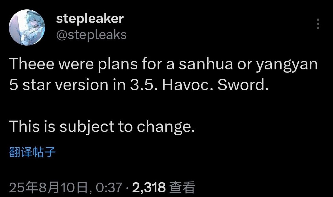 Future banner info3.5 上半秧秧SP,湮灭,主力输出3.5 First half YangyangSP, Havoc, main dps3.5 下半穗穗,秧姐,冷凝3.5 second halfSuisui, sister of Yangyang, Glacio*落地前随时可能改变*STC