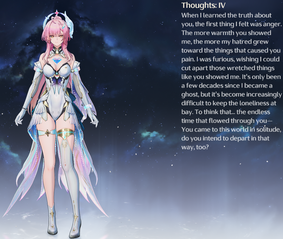 >>557718259Fuck my screenshot folder breached 6k images, and I still have the latter half of 3.1 to do. I expect another 300.>>557718439The only time Rover gets the talisman is after the events of 3.1. Past Rover never has it. Present Rover effectively brought it to the future to serve as the ANCHOR for Aemeath