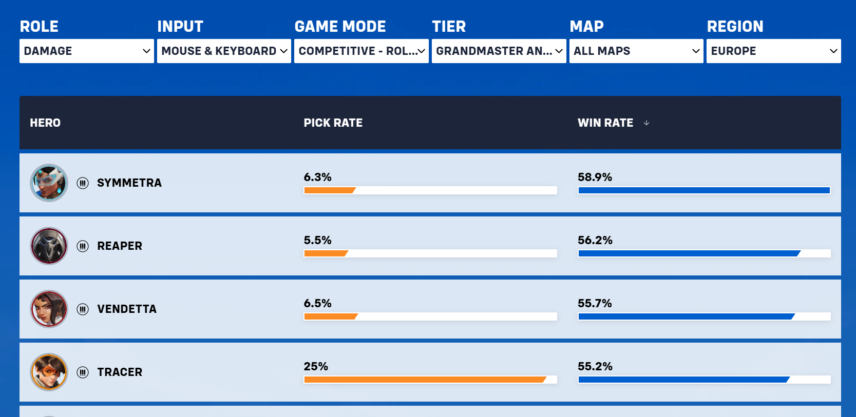 https://overwatch.blizzard.com/en-us/rates/?input=PC&map=all-maps&region=Americas&role=All&rq=2&tier=All