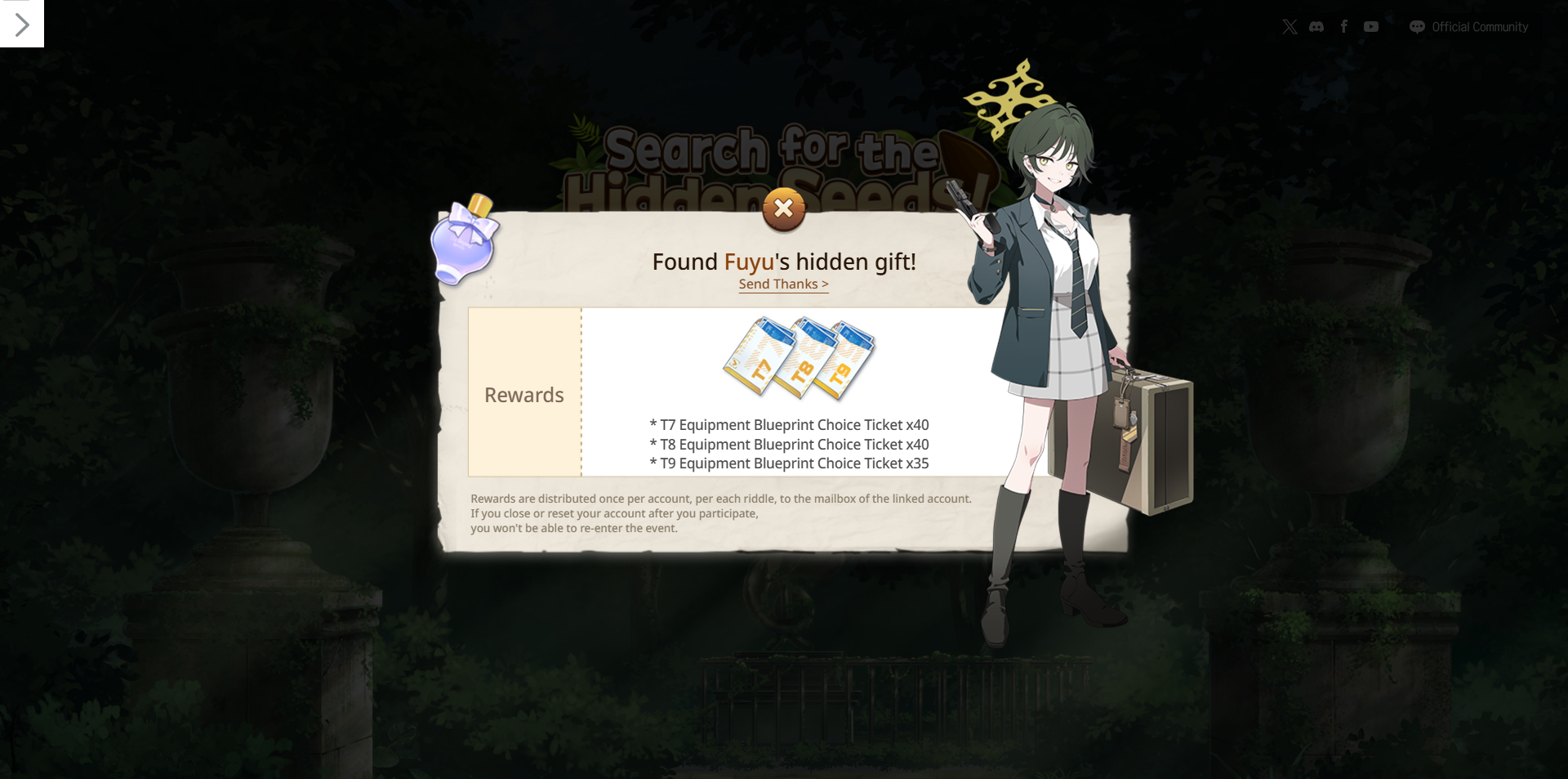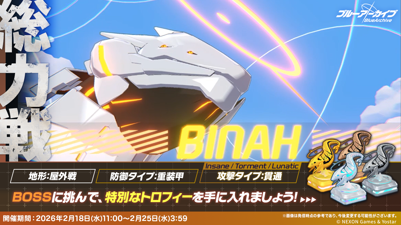 Previous Thread: >>557680589>Guides, Resources and useful links:https://rentry.org/bagguides>/bag/Circles/Clubs/Friends:https://rentry.org/holdingthebag>4koma, Manga, Side Content, PVs & Shortshttps://rentry.org/bacontent>>(JP) – JST>Banners:>2/12 After Maint – 2/25 10:59Yuzu (Battle)Eimi (Battle)>News:Patch notes: https://bluearchive.jp/news/newsJump/634>Events:Decagrammaton Showdown – 2/13 11:00 – 2/18 10:59Valentine's Day Promise – 2/18 11:00 – 3/4 10:59>Content:Total Assault: Binah (Field) – 2/18 11:00 – 2/25 3:59Limit Break Assault: The Fury of Set (Field – w/Special Armor) – 2/13 11:00 – 3/18 3:592x Normal – 2/12 4:00 – 2/18 3:592x Bounty – 2/18 4:00 – 2/25 3:592x Account EXP – 2/21 4:00 – 2/24 3:592x Commissions – 2/25 4:00 – 3/4 3:592x Account EXP – 2/28 4:00 – 3/1 3:59>>(GLOBAL) – UTC>Banners:>2/10 After Maint – 2/24 1:59MiyoFuyuSatsuki>News:Patch notes: https://forum.nexon.com/bluearchive-en/board_view?thread=3367918>Events:To Whom Art Belongs: The Fate of Forgeries and Aesthetics – 2/10 After Maint – 3/3 1:59Search for the Hidden Seeds!: https://bluearchive.nexon.com/events/2026/02/wildhunt – 2/10 After Maint – 3/2 18:59The Arius District's Emergency Class Mission – 2/3 2:00 – 3/10 1:59My Office: https://bluearchive.nexon.com/user/myoffice>Content:Total Assault: Geburah (Field) – 2/17 2:00 – 2/23 18:59Limit Break Assault: The Fury of Set (Field – w/Special Armor) – 2/11 2:00 – 3/9 18:592x Bounty/Scrimmage – 2/9 19:00 – 2/16 18:592x Normal – 2/16 19:00 – 2/23 18:592x Account EXP – 2/20 19:00 – 2/22 18:592x Lesson/Hard – 2/23 19:00 – 3/2 18:592x Account EXP – 2/27 19:00 – 3/1 18:59