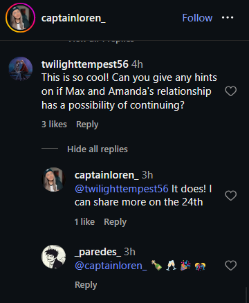 https://x.com/AdnanRiaz9/status/2023874997006332027> More detailed announcement coming next month on the comic, including preview pages>Hinted that she could write more about Max and Chloe in 2026