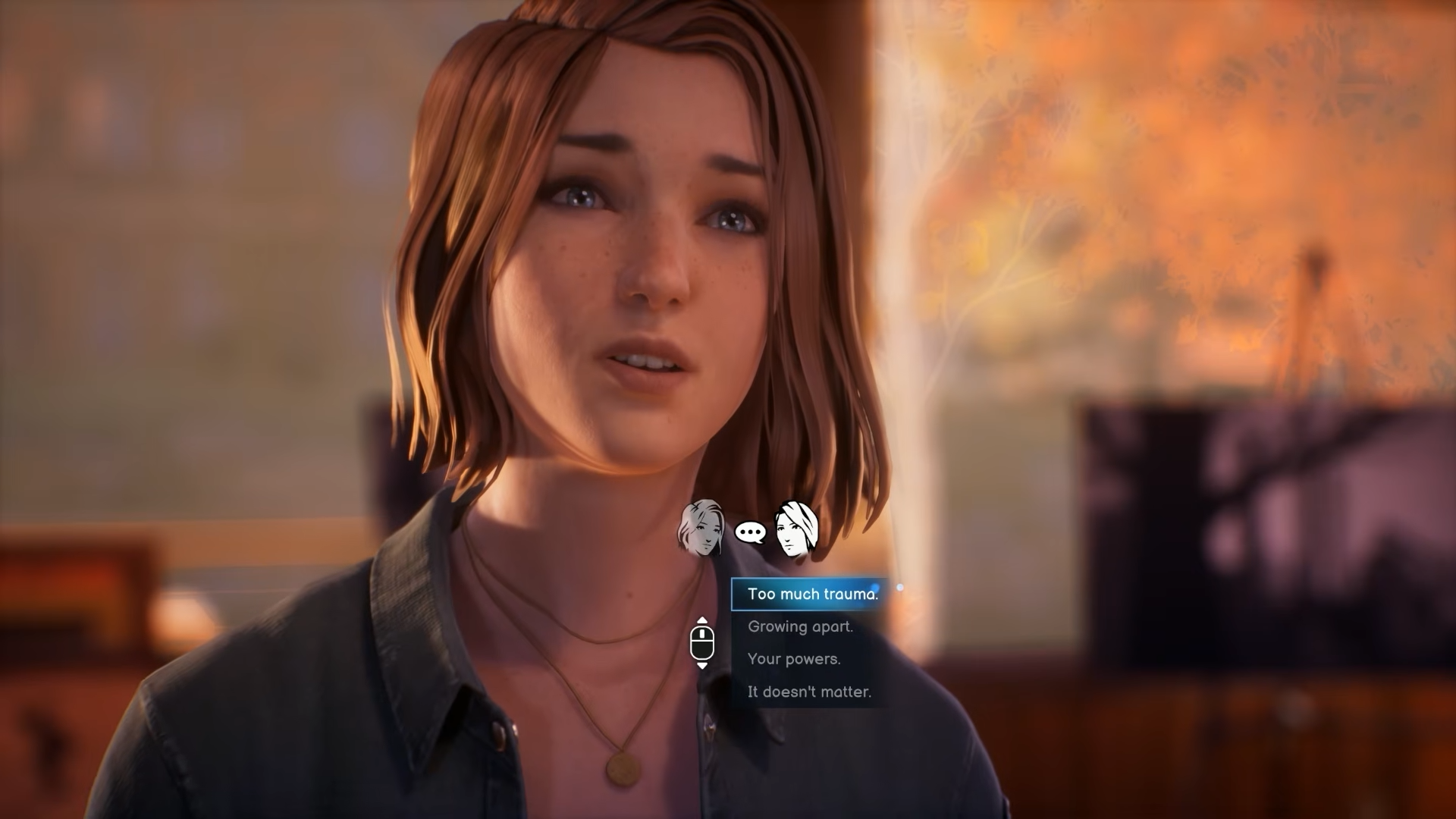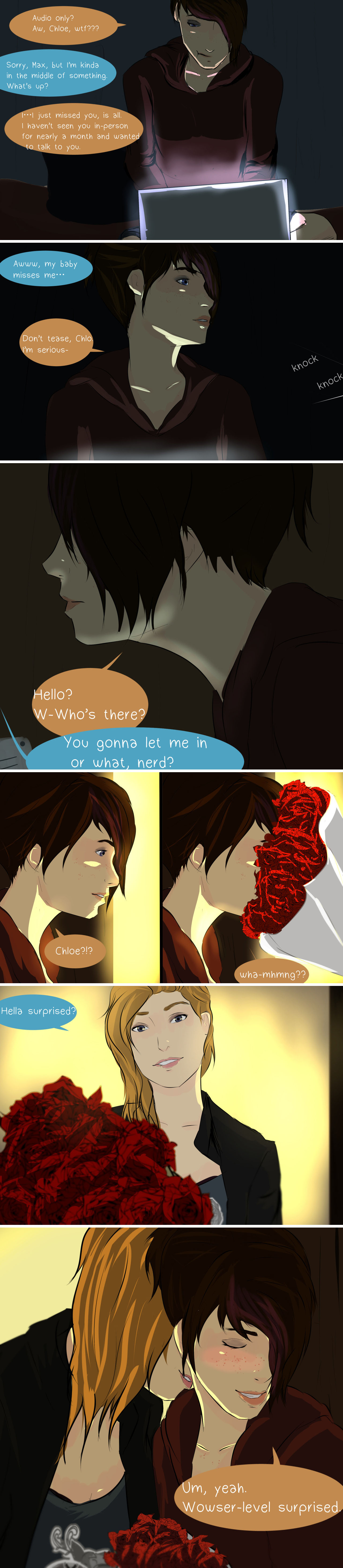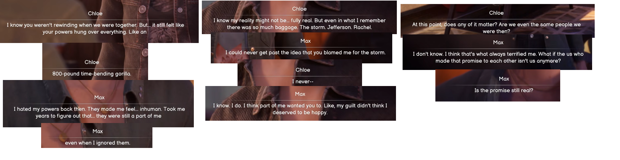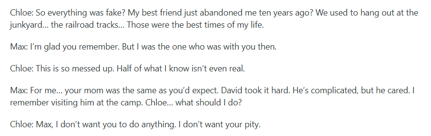 >Max: For me… your mom was the same as you’d expect. David took it hard. He’s complicated, but he cared. I remember visiting him at the camp. Chloe… what should I do?>Chlorine: Max, I don’t want you to do anything. I don’t want your pity.Kek