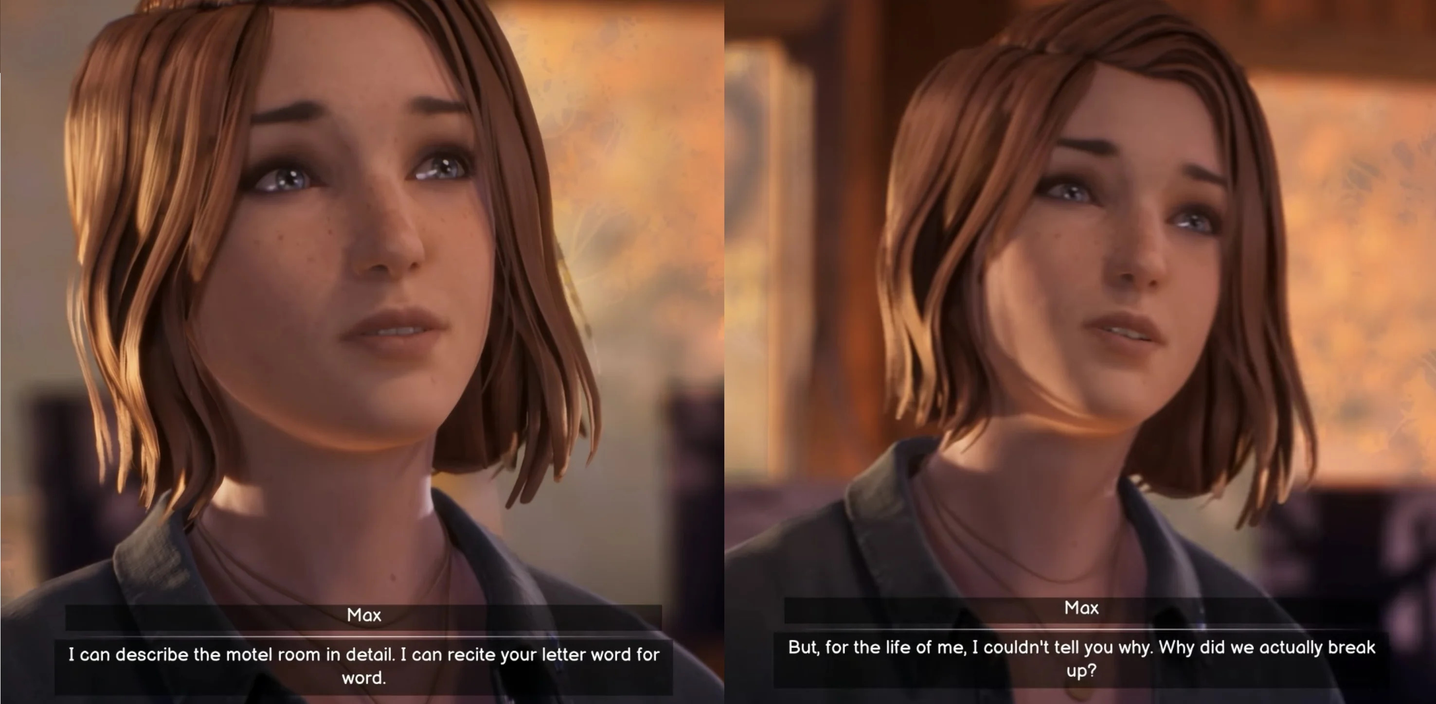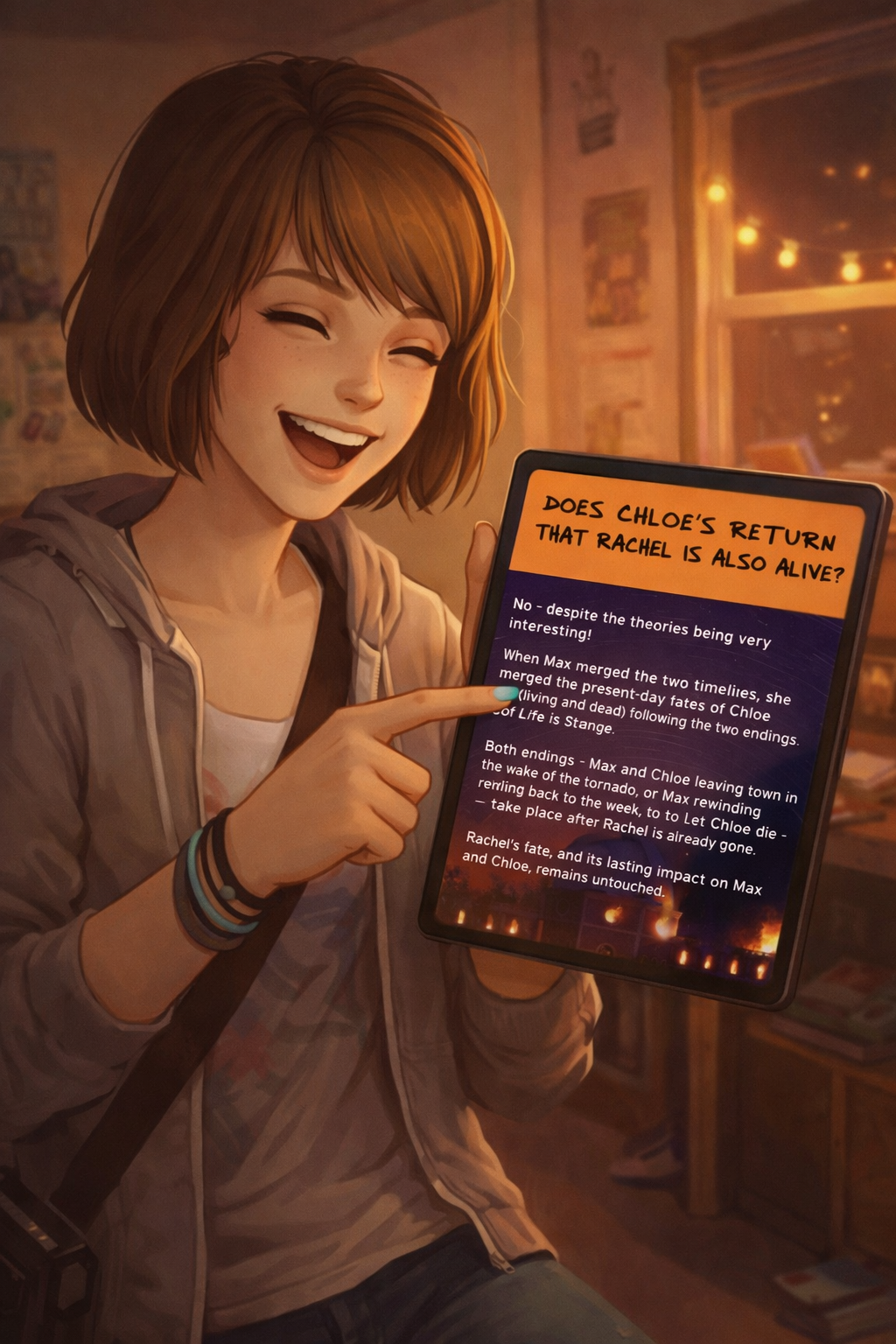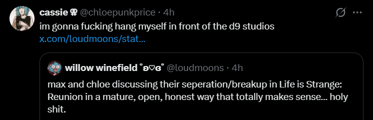 >>558793884We can definitely say much more about Rachel and Chloe than just based off those three days. We know Rachel was in a relationship with Frank and at least was infatuated with Jefferson. She hid this from Chloe because she knew Chloe wouldn't react well. She probably knew Chloe had a crush on her. She seemed to believe Jefferson was a better plan for getting away from Arcadia Bay than Chloe was. I get the impression that Rachel liked Chloe but wasn't as attached to her as vice versa.We also know from LiS2 that Max and Chloe were together at least through 2017 (four years after the first game) and were good enough together that the Away crew liked them. Max's photography career is doing well. While it's not much to go on, the intent is to show Max and Chloe are okay. And, sure, you can argue that realistically most relationships don't last forever, but nothing in the limited followup we got was meant to indicate toxicity or whatever.