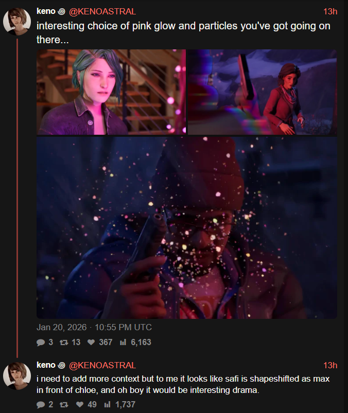 >>557831995The Safi visions are probably somewhere around the middle of the game, after they meet in Caledon when Safi returns. But if she had them before arriving in Caledon, one plausible explanation is, as you said, Safi's search for other people led her to Chloe, maybe because she's trying to figure out the origins of Max's powers leaving no stone unturned. Another is she trained her powers enough that it evolved so that she can skew your perception from just a picture and/or description. I like the idea that when Safi leaves a part of her in the people she imitates, it stays there and becomes a malignant tumor of sorts and that's the reason she's in Chloe's visions/impossible memories. A contrived way to make her a semi-villain. I think Safi plays a more important role than we think since she's likely the first to notice the changes of Max's timeline merge because she leaves immediately, she might be the first to discover Chloe got resurrected which poses another problem: Which Chloe does Safi meet if she did meet her? The one that survived or died?