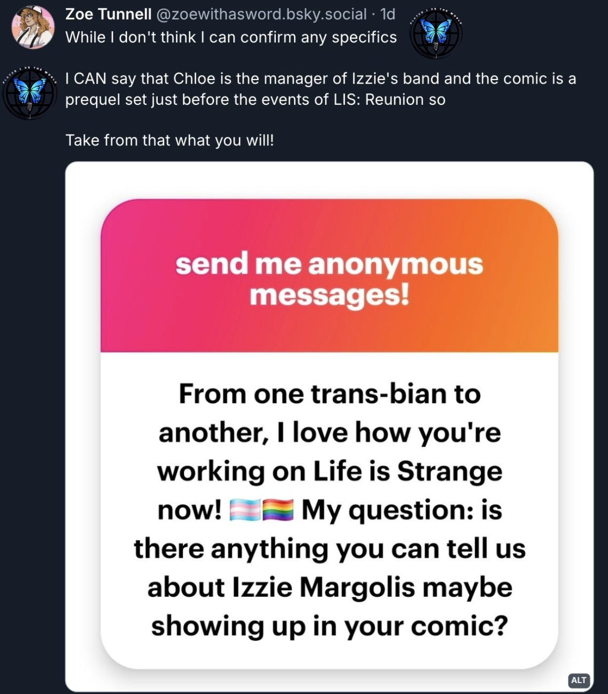 Pirates Power! editionPrevious thread: >>556570410 >Life is Strange(LiS) - An episodic narrative adventure game by developer Don’t Nod (DN). Set in the fictional coastal town of Arcadia Bay, Oregon, it follows Max Caulfield, a shy, awkward photography student who discovers she can rewind time and—perhaps more urgently—that she’s very, very gay. At the heart of the story is Max’s reunion with her estranged best friend, the rebellious, blue-haired Chloe Price. Their bond becomes the game’s pulsing queer core as they unravel the mystery of Rachel Amber’s disappearance. What begins as a teenage reconnection blooms into a messy, tender queer odyssey about grief, desire, and the impossible choices we make for the people we can't truly live without.>Official Websites:https://lifeisstrange.com/https://dont-nod.com/en/>Life is Strange Series Steam:https://store.steampowered.com/curator/36149206>Lost Records Series Steam:https://store.steampowered.com/app/1902960>/lisg/ Permalink:http://orph.link/lisg>FAQs, Old Threads/Strawpolls, Soundtrack/Music & Leaks:http://orph.link/lisgarchive>/lisg/ Community Written Fan Fiction:http://orph.link/story>Compilation of Fanfics:http://orph.link/fanfic>/lisg/ Content Producers:http://imgur.com/a/DOAKn>Art of LiS:https://www.youtube.com/watch?v=265yHETXRXo>/lis/ sings:Obstacleshttps://web.archive.org/web/20200324102651/https://www.youtube.com/watch?v=WjPsOkijFh0 Glass Wallshttps://www.mediafire.com/file/1y584yhvq5p2y35/Glass+walls+lisg+edition.mp3No Belowhttps://www.mediafire.com/file/cpi79dyuahemkd4/Lisg+sings+no+below+all+v.mp3 Discussion of other LiS games in the series like Life is Strange 2, TC, Don't Nod's other media like Lost Records, the upcoming TV show and other similar games is welcome!