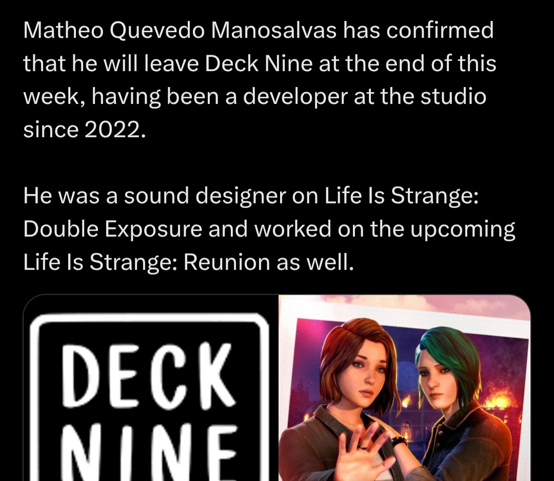 >>557856307It was Luc Baghadoust who said that. Also, that leaker was Cada, she said almost a week before the D9 writers layoffs SE was already in course correction mode and supposedly this info came from a D9 dev who slipped in her dm, and said the next game would have been a definitive closure for Max and Chloe while trying to prepare to compete with Lost Records
