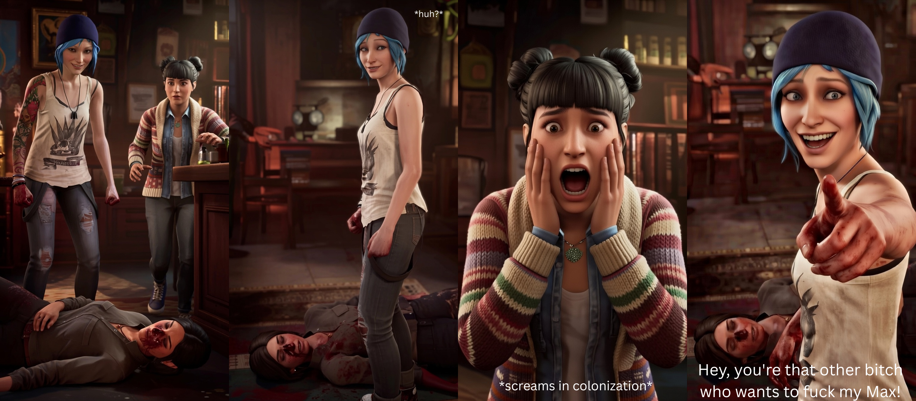 Hello I'm an OLD oldfag returning here after many years. To give you an idea of HOW old I am:>The last time I was active here was during the release schedule of BtS>I was around before LiS even got its own general and every /v/ thread made for it was hijacked by GGaters dissing it as "Tumblr: The Game">I remember when /lesg/ was in contention with /lisg/ as what to call the generalBTW: Do we still call ourselves LiSbians?Some of my degenerate credentials:>Created the /r9k/ LiS greentext thread:https://desuarchive.org/r9k/thread/20245884/#20248936>When someone claiming to be Scott Blows the LiS Community Manager from Squeenix came to visit /lisg/, I presented a detailed list of what I imagined the pubes and genitals of all the LiS characters would look like and asked if the devs thought that was accurate. This became known as the infamous "pube post" (I didn't make up the list for the female characters. Someone else did, but I couldn't find the original, so I rewrote all that from memory. I did however come up with the descriptions of the privates of all the male characters.)The guy claiming to be Scott never posted again after that.>I was the first to call the alt-universe crippled Chloe "Quad Damage Chloe.">When drawfren Dementiaz offered a custom sketch to whoever wins a roll, I won that roll. My suggestion was to have Alice the Bunny humping Lisa the Plant. But there was a better suggestion of having Max, Chloe, Victoria, and Kate all smoking a bong and having fun. So I requested they be combined. (Picrel)>I remember when Mari appeared here and got bashed for namefagging/tripfagging.>I remember all the wild theories for LiS such as Sean Prescott running some sort of Epstein/Q-Tard level human trafficking ring complete with virgin sacrifices. And the Vortex Club being a cult that worships the Storm and satiates it with human sacrifices.>Or Rachel's Mom Sera being some sort of Witch.So wassup? Is /lisg/ as dire as it now looks?