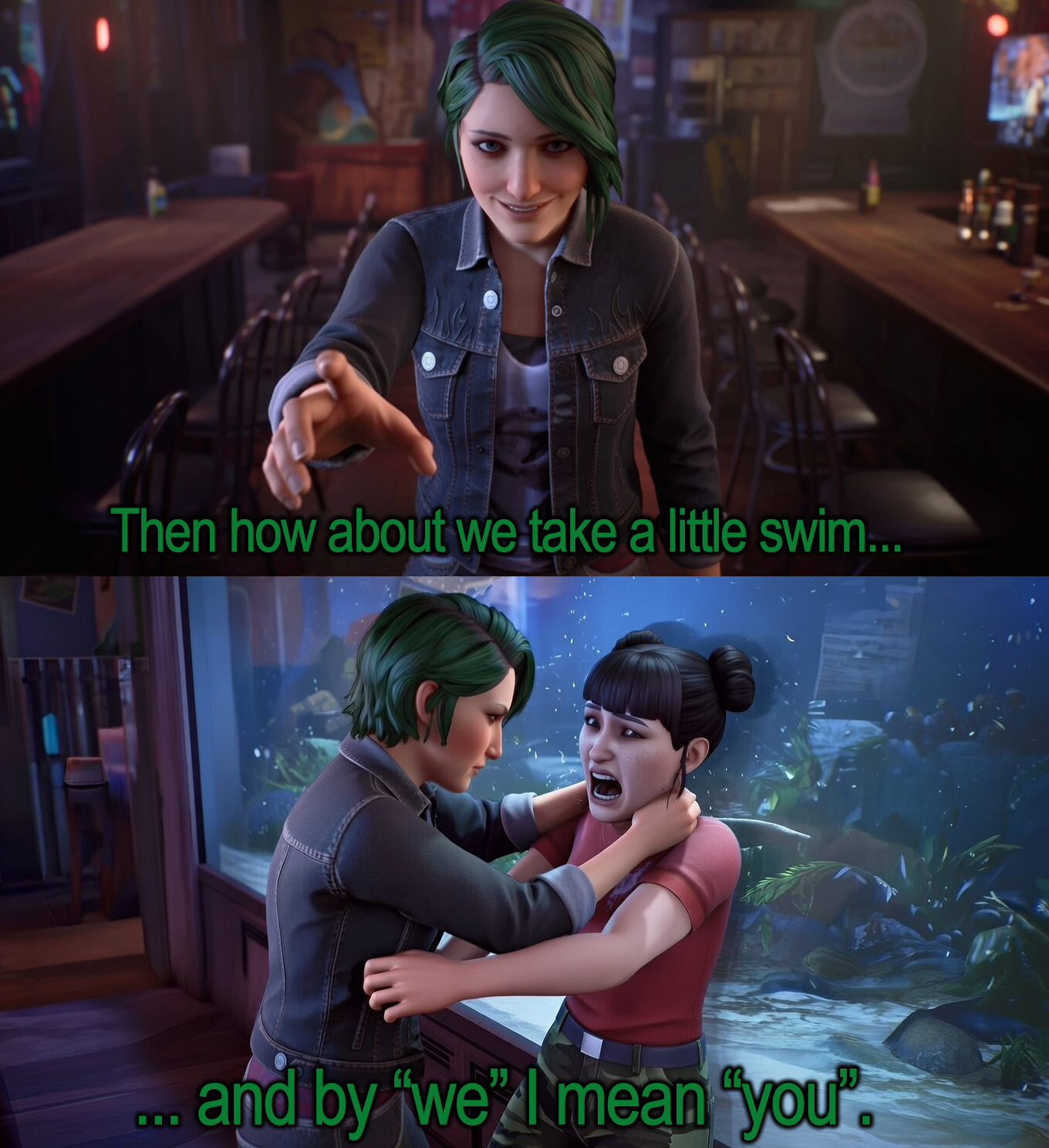 >>557744861I think the conflict is indirectly there when you decide whether or not to answer Kate's phonecall >answer it and Chloe gets mad at you for ignoring her>ignore it and Kate brings it up on the roof