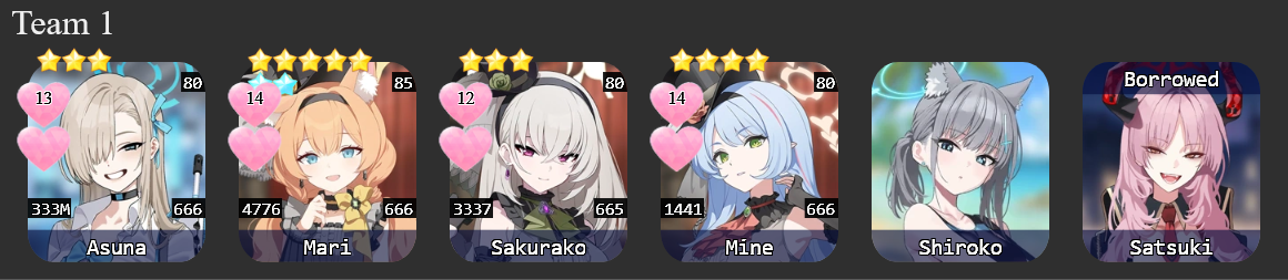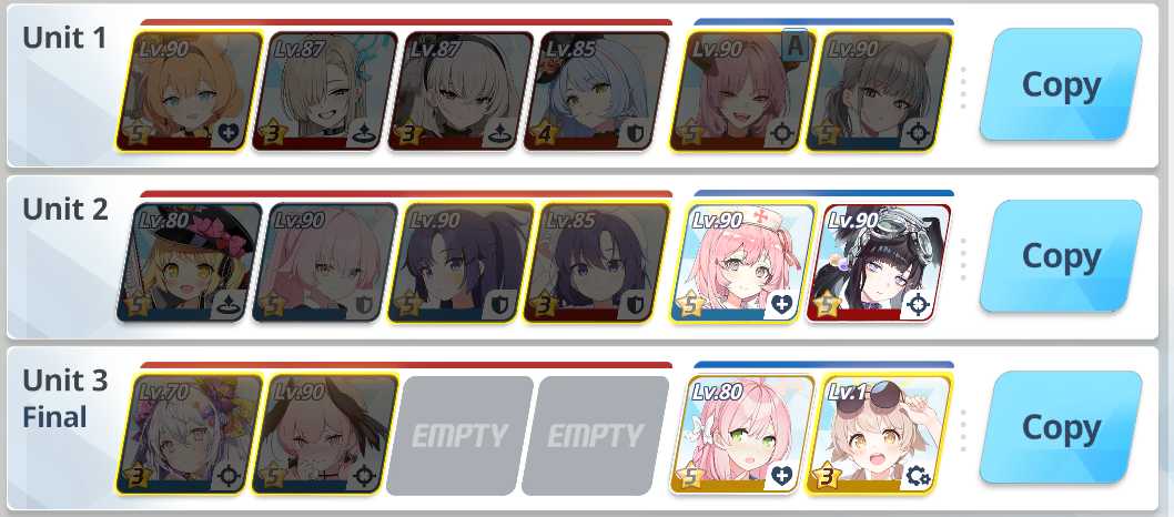 >>5577599863* Mimori with lv1 skills is fine as long as she has a lv4 bag and 60-70 levels.Oh yeah, you might need to level 5 your Fubuki's EX for her to kill the ice pillar through the shield. If she can't do that, then your T1 will have to scrape the barrel with what I hope is a UE40 Koharu you've got in the closet instead of Kokona, since if you're not killing the pillar quickly through the shield Kokona will not survive the big wave.I would recommend against the bHosh repositioning strat with Kokona. Kokona has survivability problems, and malding BHosh repositions isn't going to help her solve them. It'll be too much to deal with at the same time.