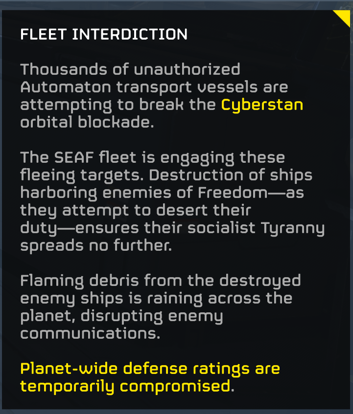 >we lose Cyberstan>the narrative shifts to a defensive one in wake of the bot counter attack>super earth forces heavily depleted, now has to deploy helldivers to reinforce SEAF operations more directly>new mission type is just like existing missions except now there are 1 or 2 SEAF outposts on the map whose survival is a side objective>can reinforce the outposts by deploying turrets or other fortifications, SEAF troopers will man the gun, grenade wall, and AT emplacements if left nearby>if helldivers take a SEAF SAM or artillery site while a SEAF outpost is alive, the new site will be garrisoned by troopers>this era of helldiver and SEAF joint operations leads to us finally getting the SEAF stratagem>the new mission type also paves the way for bigger SEAF outposts/forts as well as mission types with two enemy factions on border planetsthere I salvaged the forced loss and made it fun
