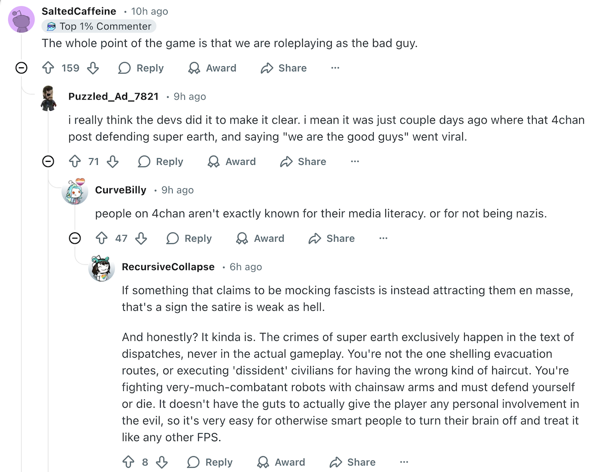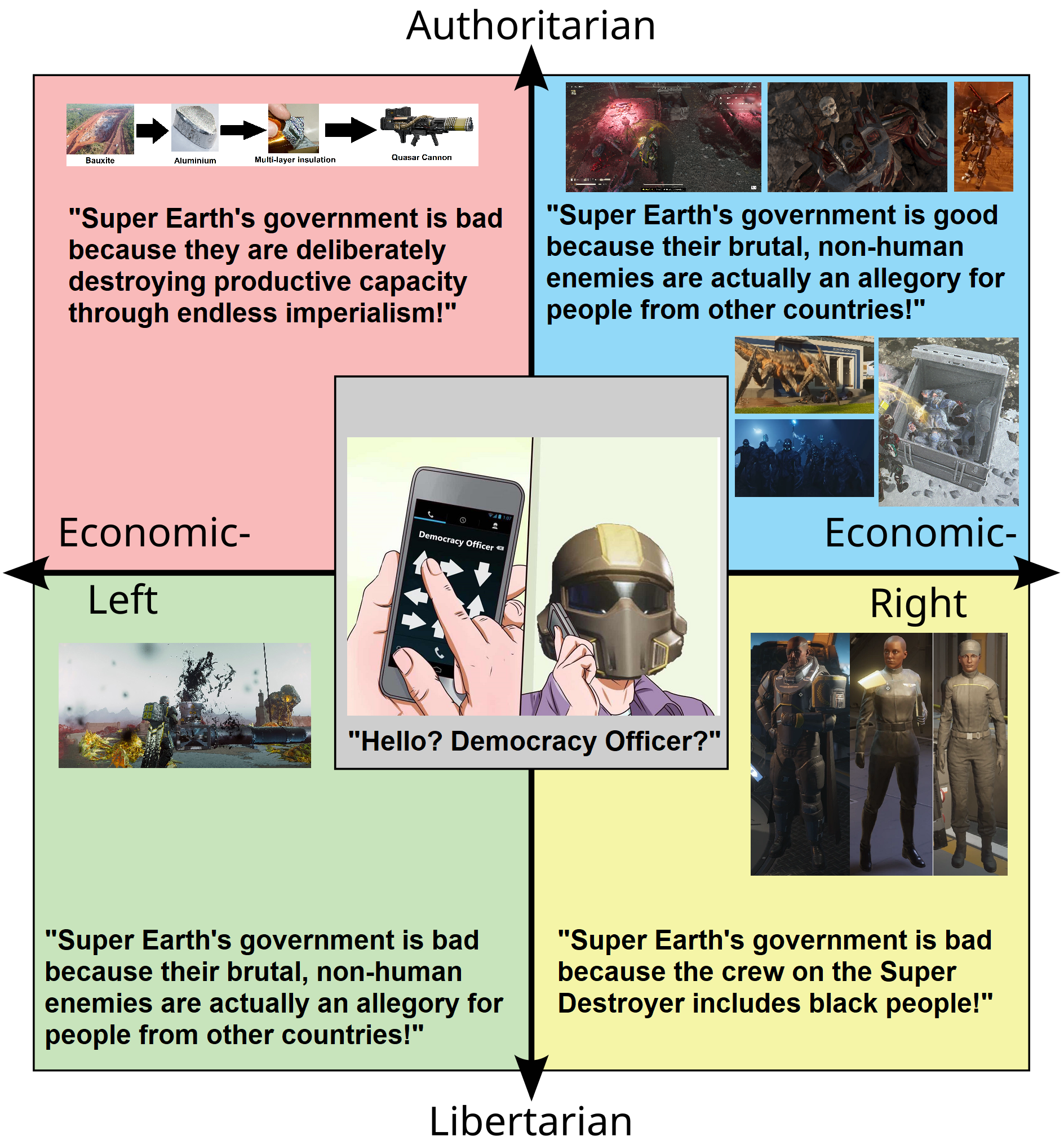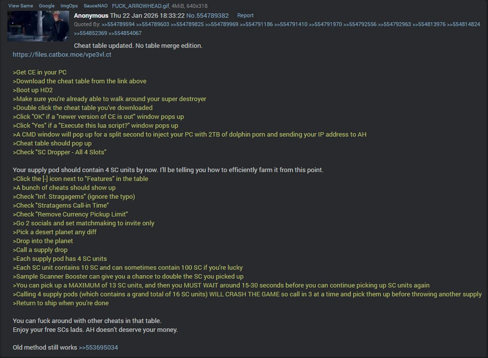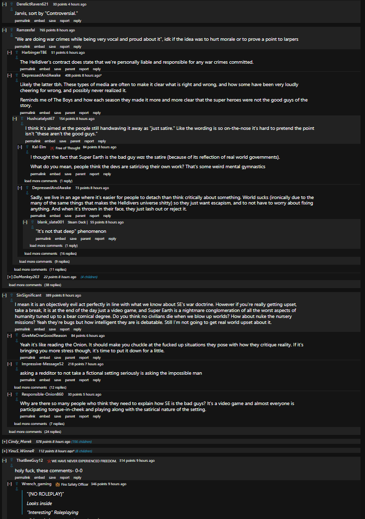 >>557791551>literally every single problem SE is facing in Helldivers 2 is of their own facing>bots were attacked by SE for breaking away from humanity>bugs were engineered into terminids and made increasingly worse by experimentation>SE just raped and pillaged the squids because they could>fighting a three-front defensive war taking billions of casualties permanently losing more and more territory >ACTUALLY WANTING PEACE WITH BRO- I MEAN ALIENS IS SUICIDAL CHUDDIE NOTHING BAD COULD COME FROM TRYING TO SUBJUGATE AND KILL EVERYONE