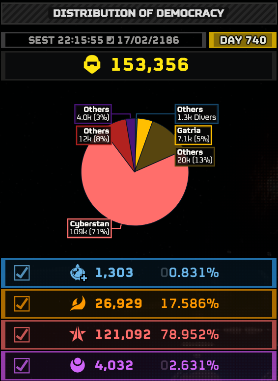 >be arrowhead>want to make a unique cyberstan campaign>players have to liberate successive cities until they reach the final one>could just do it with a normal city planet since that's how they already work>make a custom planet with twice as many cities>want to give players a choice in which city to use to progress to the next tier>make all the cities basically identical>never explain any of this ingame>playbase randomly distributes across the cities>only the 30-40k consistent players know to group up, but right now they're only 30% of the playerbase>make it so you need at least 60% players to do anything>nobody makes progress until you tell them which city to go to anyway>make a global lives bar>realize that returning players are an active detriment and lower lives without boosting liberation at all>have to keep boosting it so the whole vent doesn't fail>make "the march to cyberstan" a unique MO where you have to raze planets to avoid invasions>doesn't make any fucking sense, players don't realize what you're doing until the third planetWhat a retarded fucking invasion this has been