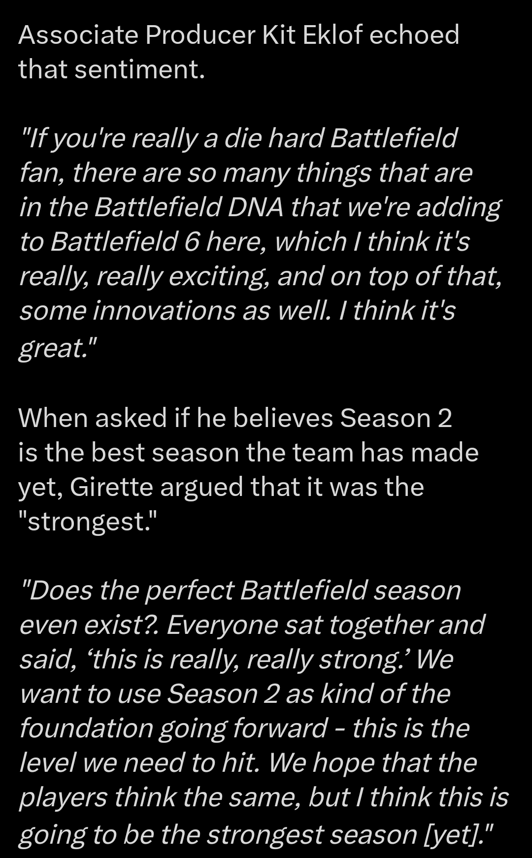 >have the gall to claim they were "biting their nails" hoping s2 would go over well when everyone knows at this point that everyone at dice besides 3 codemonkeys somewhere in Mumbai is working on bf7, and they don't give a fuck about bf6