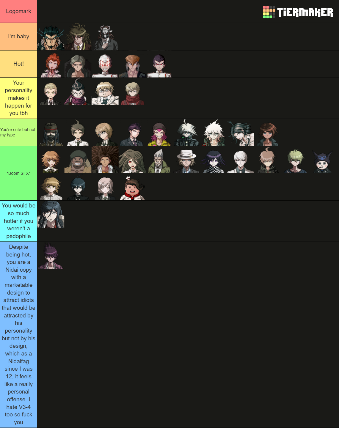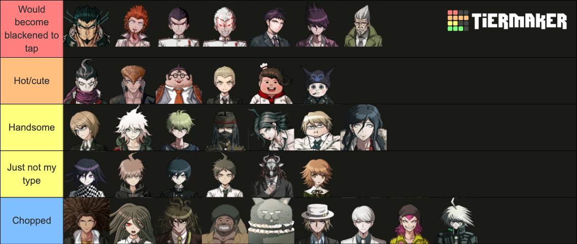 >>557799559I have basic tastes but I also like chubby men and DILFSKaito gets a bonus for personalitySouda would be hot but knowing his personality ruins itMunakata has the "polite young man" haircut, if he fixed that then maybe he would be much higherIf you'd like to make your own:https://tiermaker.com/create/danganronpa-all-characters-games-novels-and-anime-360438