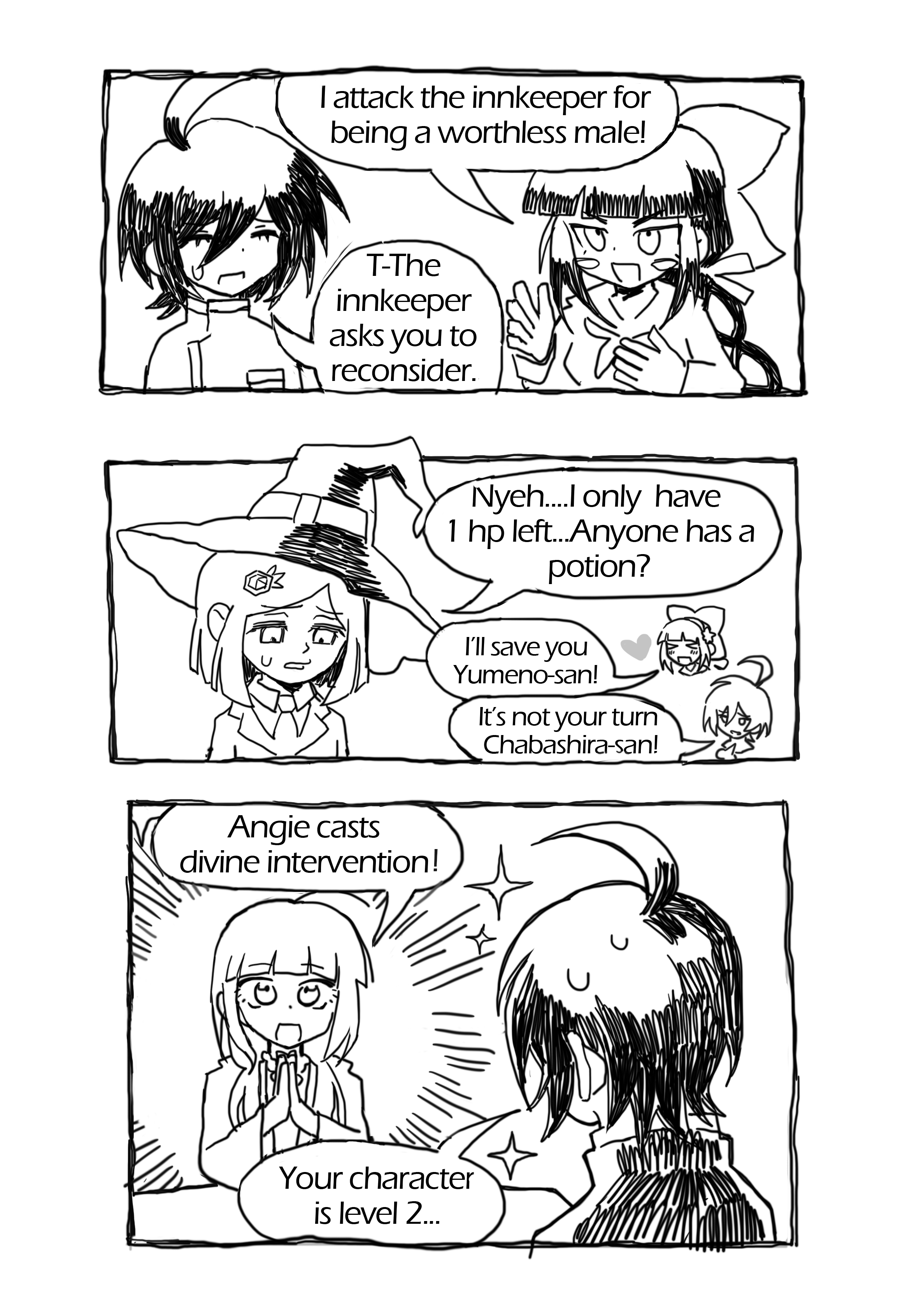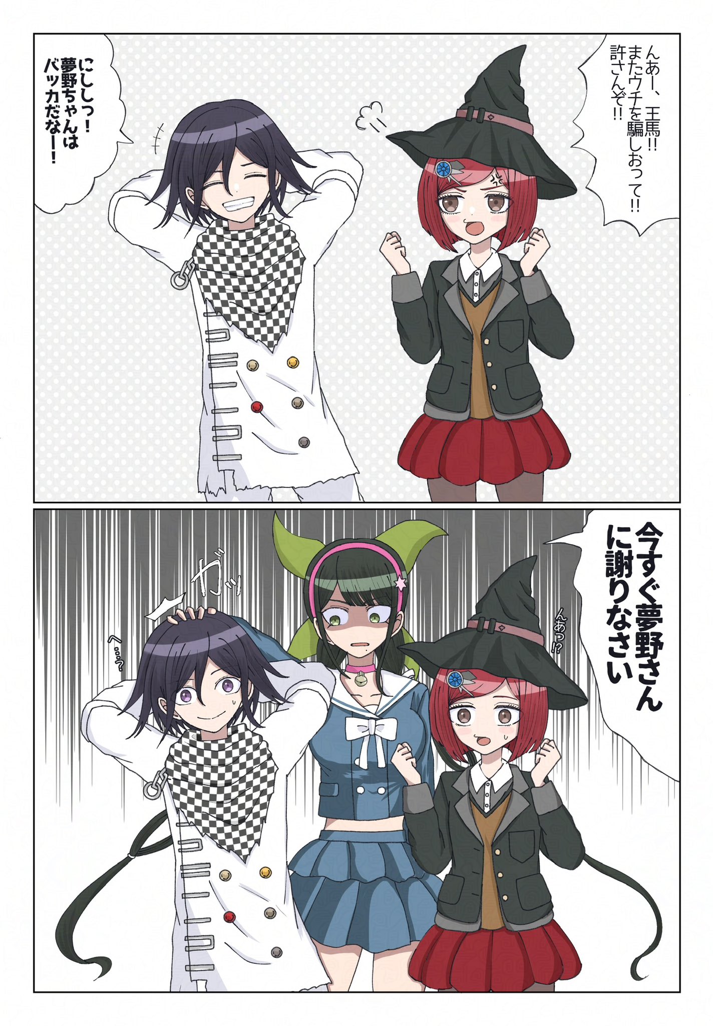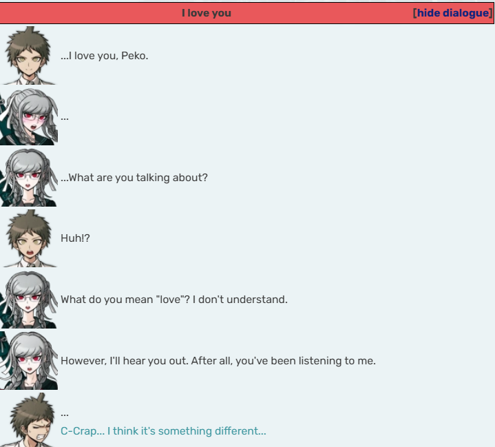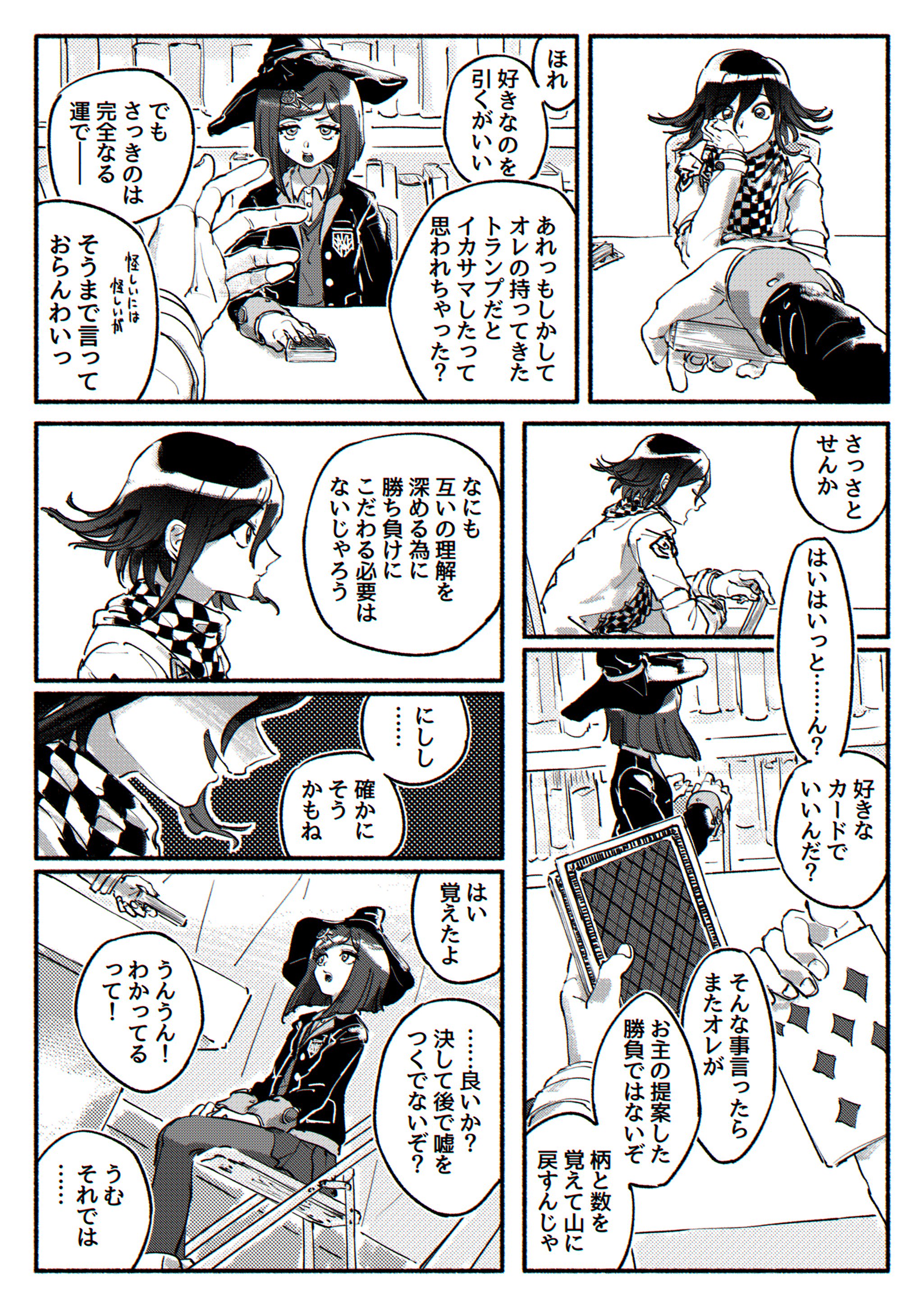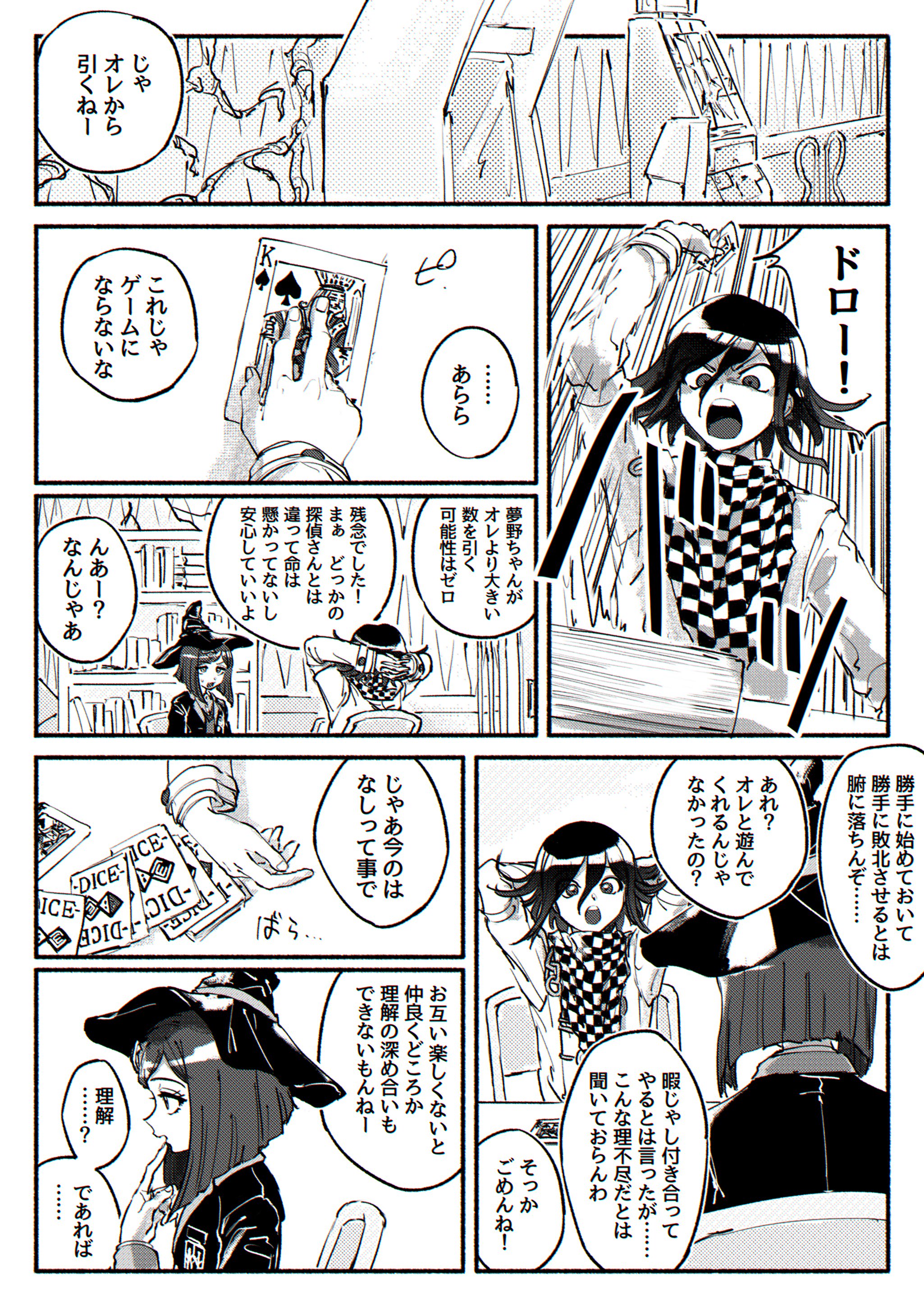 >>557959378>Himiko: The card you chose is—>Himiko: This one!>Himiko: ............>Kokichi: ............>Kokichi: Hmm?>Kokichi: Ooh! You did it! You're totally right!>Kokichi: As expected of Yumeno-chan!>Kokichi: I've really misjudged you! ...Wait, no, that’s not it.>Himiko: My Ace of Hearts is gone...>Himiko: You swapped it, didn't you?! Give it back!>Kokichi: Well, let’s just say this was also for the sake of deepening our mutual understanding.>Kokichi: That's just the kind of guy I am.>Himiko: Wa... Wait!>Himiko: They're playing cards! If even one is missing, they're useless!>Kokichi: See ya! Let's play again sometime!>Himiko: Hwah?!>Himiko: How annoying...>Himiko: ............
