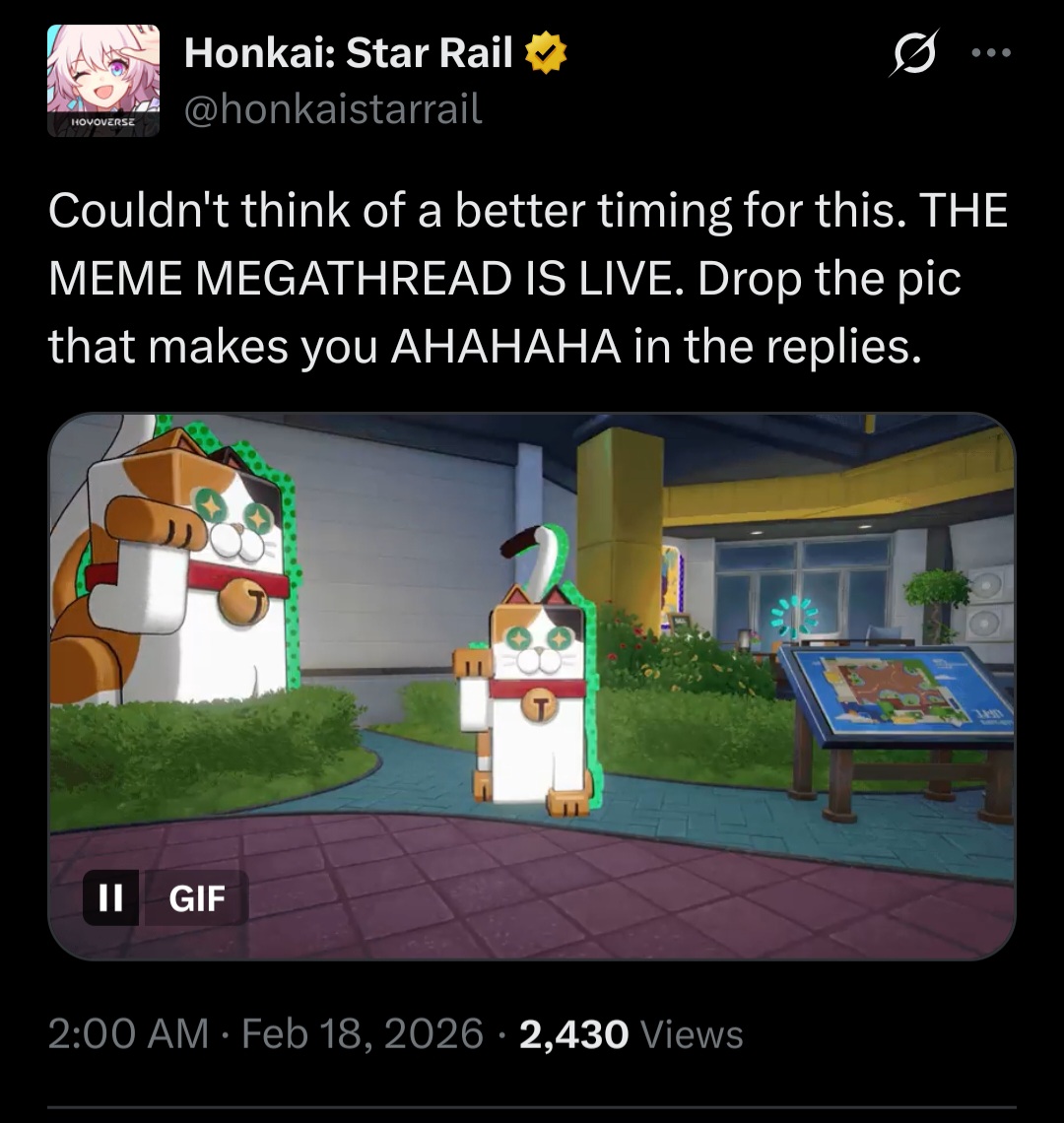 Previous: >>557754280>Version 4.0 "No Aha At Full Moon" Special Programhttps://www.youtube.com/watch?v=JwD3wN33R_A https://www.youtube.com/watch?v=r2bxxcYK9qo >Download - https://hsr.hoyoverse.com/en-us/home>4.0 Preview Page - https://act.hoyoverse.com/sr/event/e20260206version-nwlbwa/index.html>Version 4.0 Trailer: "No Aha at Full Moon"https://www.youtube.com/watch?v=2hH0hILcWPs https://www.youtube.com/watch?v=EMT6GmhDiBk >Yao Guang Character Trailer: "All the Best"https://www.youtube.com/watch?v=XpQ0TXUnESQhttps://www.youtube.com/watch?v=ke8-S0MnoV0>Improv Tour Trailer: "Binge It All! The Truth After the Battle of Irontomb!"https://www.youtube.com/watch?v=VsrABLcQQvc https://www.youtube.com/watch?v=FOj68wLqj7A >Myriad Celestia Trailer: "Anti-Destruction Alliance"https://www.youtube.com/watch?v=ZwnE5o7_gzA https://www.youtube.com/watch?v=_2YD35PJOmU >Improv Tour Trailer: "Beyond Weal and Woe"https://www.youtube.com/watch?v=kmzwoua4dUk https://www.youtube.com/watch?v=cKxHKZaEURk >Aha's Favorites: Phantasmoon Games Winners Compilationhttps://www.youtube.com/watch?v=saTCKwpVewkhttps://www.youtube.com/watch?v=CzI5ivqZNRo>Aha's Favorites: Looking for Aha Special Programhttps://www.youtube.com/watch?v=bW6XV9Vt6JMhttps://www.youtube.com/watch?v=y3ZWKIRhca4>Current Character Banners: Yao Guang, Evernight, Black Swan + Pela, Hanya, Qingque - https://www.hoyolab.com/article/43738489>New Drip Marketing:>Ashveil (5* Lightning Hunt) - https://www.hoyolab.com/article/43666646>Redeemable Codes - https://hsr.hoyoverse.com/giftKBJ8VZ6Y27QXXAK9QJ454SG7MH5KCBGF3AAT45QSTARRAILGIFT>/hsrg/ Tools & Resourceshttps://rentry.org/hsrg-resources-14>/hsrg/ Thread Templatehttps://rentry.org/hsrg-thread-template-14