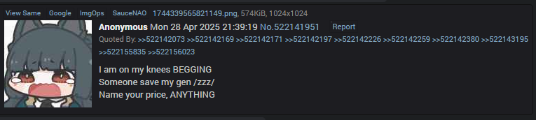 >4.0 discussion happened a grand total of 2 or 3 threadsholy fucking flop.I usually excuse hsr having literally 0 /v/ threads while genshin and ZZZ gets near daily threads over there meaning the /vg/ generals won't be as traffic heavy as /hsrg/ but this general manages to both be fast in engagement while also absolutely talking about nothing at the same time.