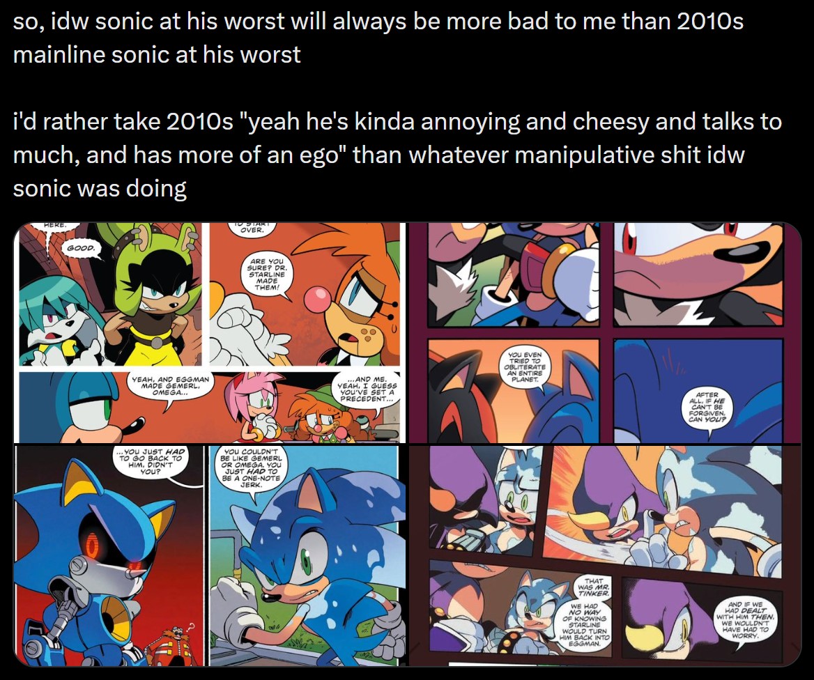 >>557791994The worst part is that the concept could workIt just had a weak foundation, poor execution, and absolutely no resolution. All while portraying Sonic in the most condescending manner possible.Why do I say this?Because the Metal Virus and Issue 50 pissed me off so much I decided to write my own own outline exploring the concept just to see if I could do better