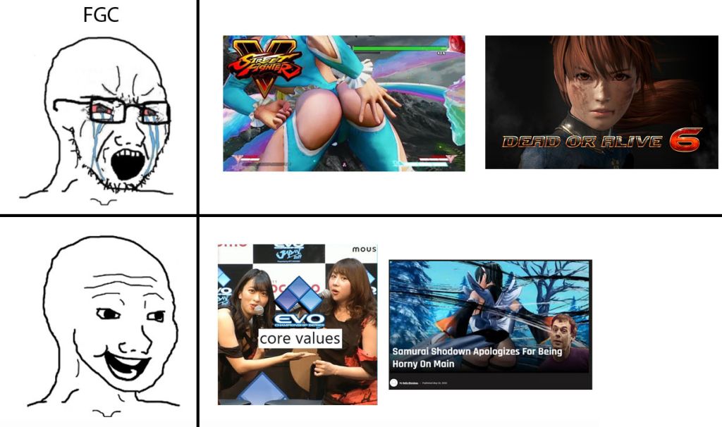 >>557791173FGC cretins are gonna act like DOA gives them the ICK but then POG out at safe horny slop in tokon and ass jiggle in SF6