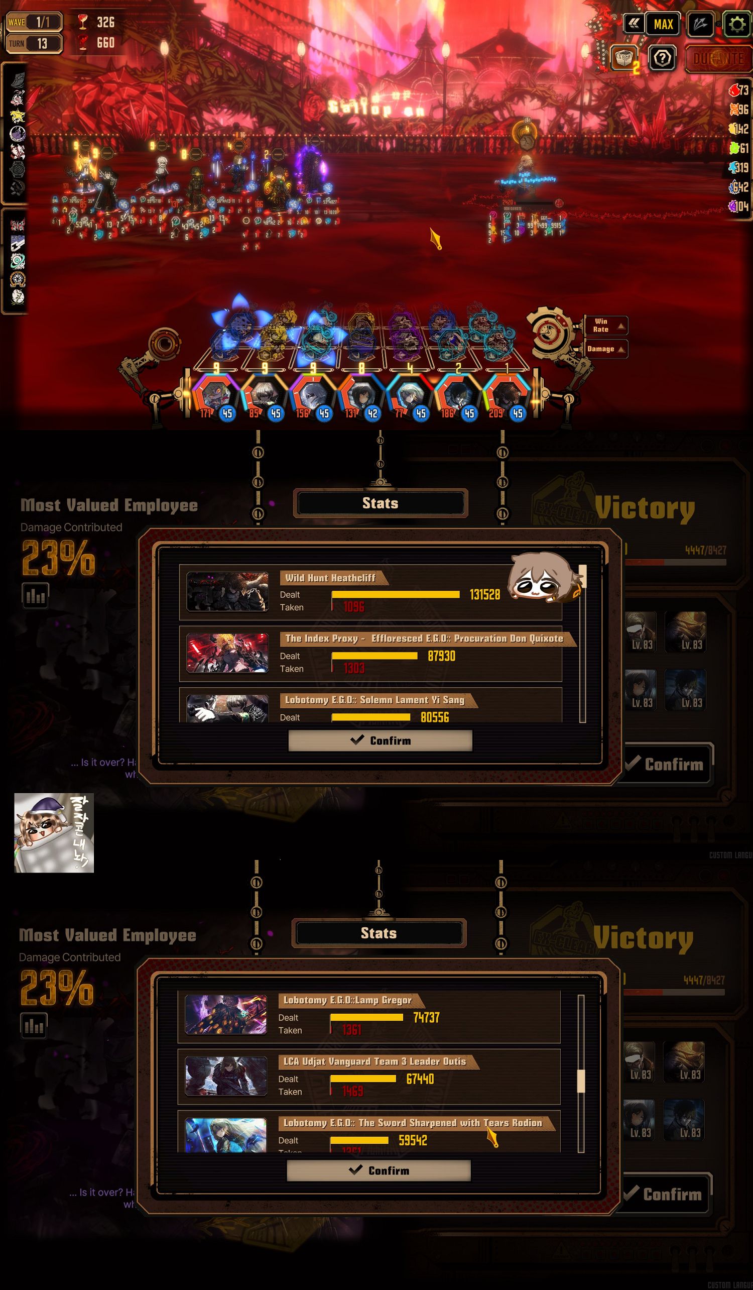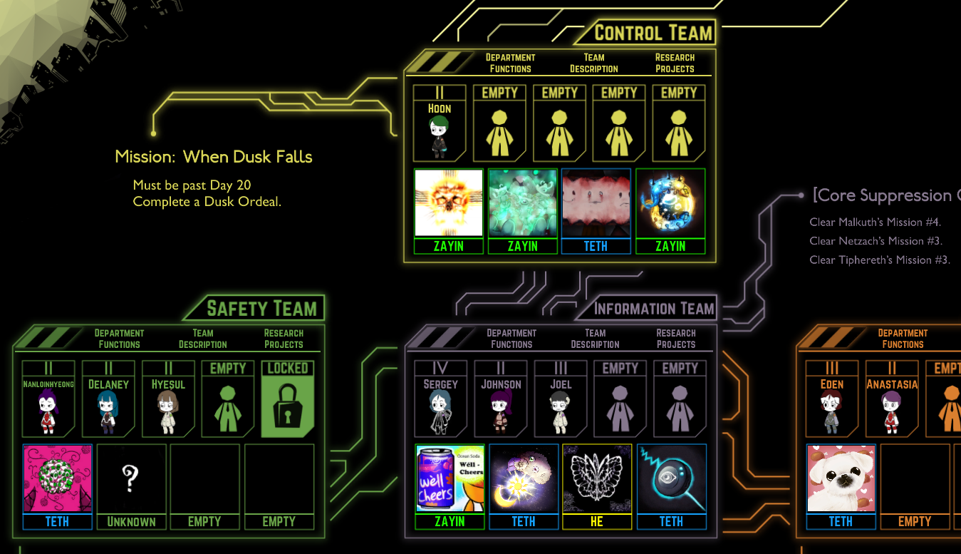 >>557805884Don't end the day once you reach the energy quota unless you have horrible abnos that break out if they aren't handled after a meltdown. But from what you posted many of them if ignored would just remove a bit of your energy, meaning it is the time to get new dudes and raise their stats.