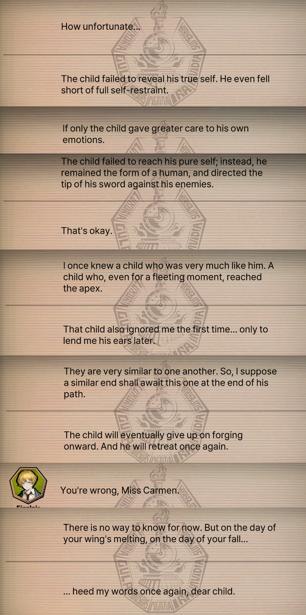 >>557803634>Would the process that was cut short really not help people embody egos?I think you misunderstand. Carmen was lying to everyone at LobCorp about what she really wanted with the Seed of Light (including herself, judging by the Enoch suicide). She wants distortions - she wants EVERYONE in the City distorted, she very explicitly calls Phillip getting EGO a disappointment (pic related) and was making Argalia her champion in salvaging the "Distort Everyone" plan (even warning him about Iori) after Angela inadvertently ruined it thinking she was ruining the City's salvation for spite.Carmen believes no one will ever be true to their feelings until they are forced out in the most raw manner possible, and that acting in accordance with those emotions is the only to live with meaning. It doesn't matter if it means actively torturing and dehumanizing yourself like Heathcliff or warping around to turbo-bugman obedience like Yan. The Seed of Light would've driven everyone into become one-dimensional shells of themselves even if they felt comforted by it.