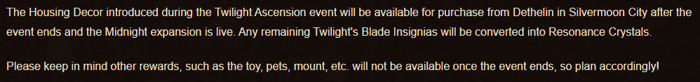 >>557819482>The Housing Decor introduced during the Twilight Ascension event will be available for purchase from Dethelin in Silvermoon City after the event ends and the Midnight expansion is live. Any remaining Twilight's Blade Insignias will be converted into Resonance Crystals.https://worldofwarcraft.blizzard.com/en-us/news/24247523/experience-the-twilight-ascension-pre-expansion-event