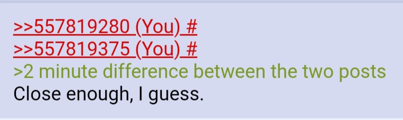 >>557819280>>557819375>2 minute difference between the two posts Close enough, I guess.