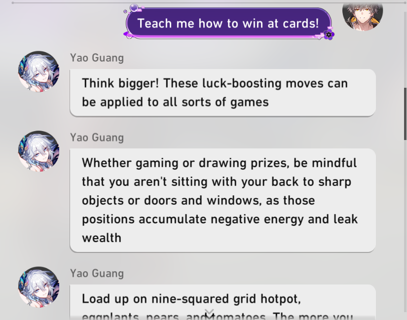 just finished 4.0. Anons weren't lying, that was pretty good. Not very high stakes but also pretty straight forward. The sunday and yao guang parts could have been removed though. I don't think they served much purpose. Overall, the chapter was easier to follow and go through because it felt very much unlike star rail and the one mini game it had wasn't really forced on you too much. but the bingbing wahoo sections did get too repetitive towards the end.The plot in general seems to be mishmash of various anime mystery drama like higurashi and death note with a very obvious inspiration on dangan ronpa, down to the purple blood stains.Felt bad for sparkle and sparxie ended up being an unlikeable bitch. Not sure if I want to spend a lot of jades on her now.Also, it's very very obvious that Yae is supposed to be the main push of this story. I'm not just seeing it with SW so far.