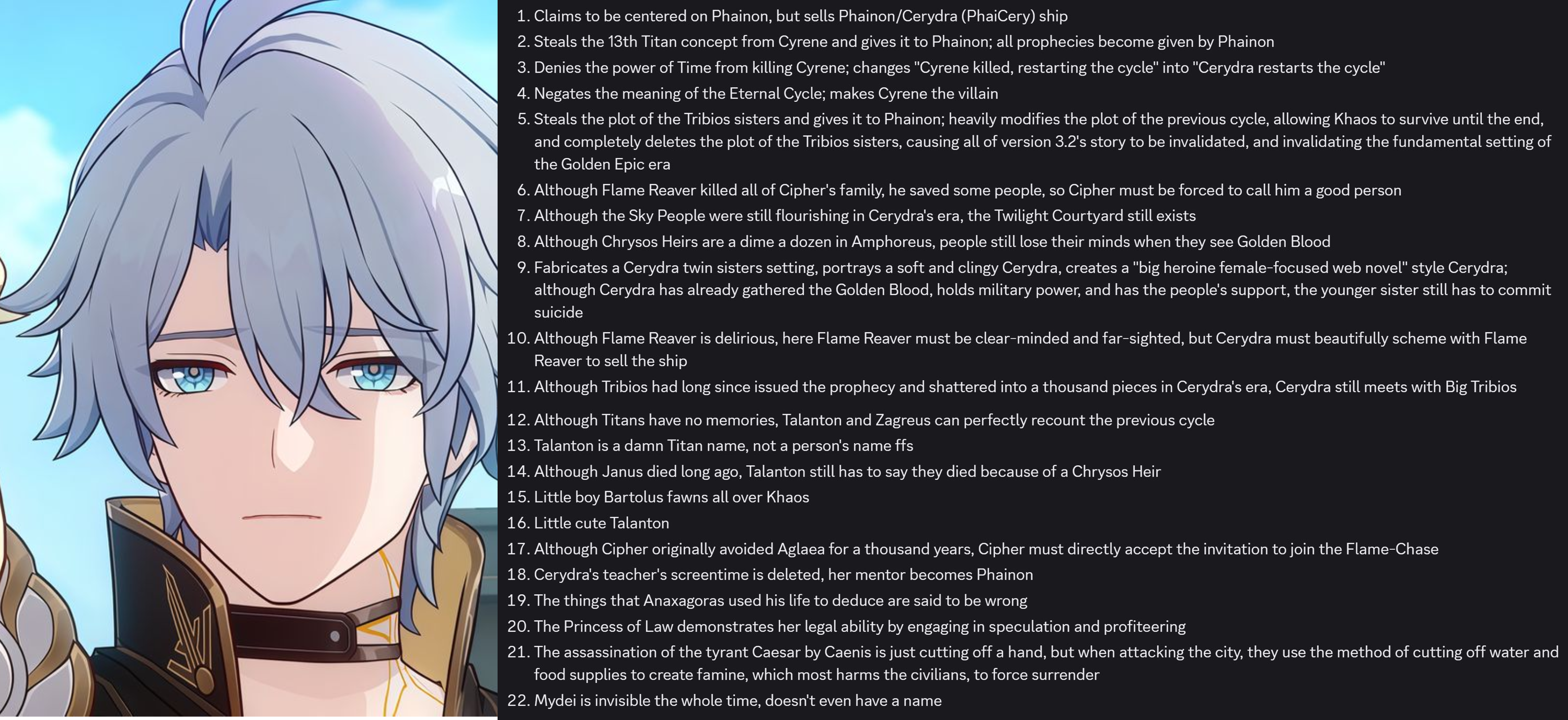 >Could have kept Cyrene as Mem, but turns her into a villain >Just erases Mydei from the gameThe Phainon yume fears the Kremnoan prince. They can't even trust Phainon enough to simply exist in his presence.